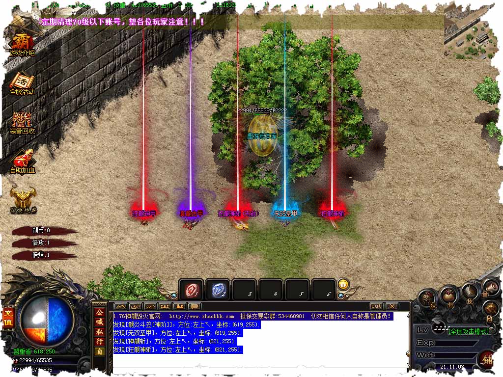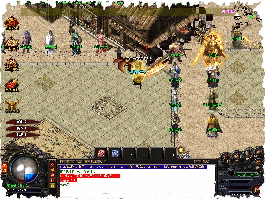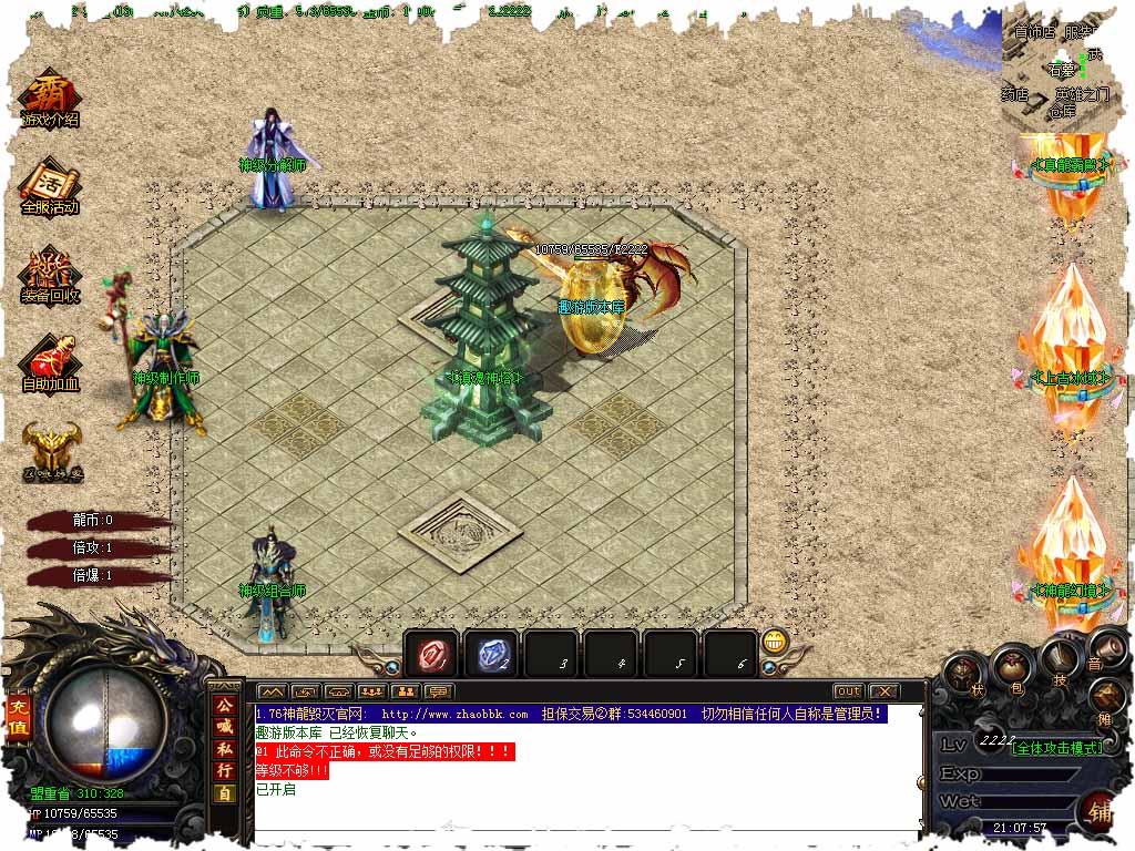 每日新区:每日宣传开放6-9个新区,开区时间就登陆器上左边显示为准,区区火爆。 版本介绍:冲元宝一律走平台,无在线GM,无比例,无任何待遇,游戏喊话均是骗子。 赞助介绍:顶赞只需100,游戏中不出售任何装备等服务,无在线GM,小心上当受骗。 特色介绍:进服不花钱一样玩,职业散人玩家天堂,赞助非常好打。 攻城奖励:新区第三天中午合区,晚上攻城奖励红包,合区才真好玩。 版本介绍:本服所有装备全部靠打,爆率全开,散人首选,经典巨作,独家品牌大服! 版本地址