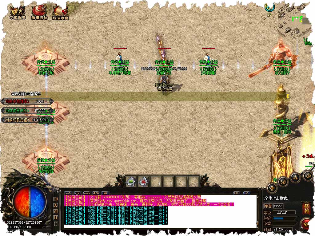 版本介绍:传说公益第一季》-《鼠年攻速篇》,上线任何地图自动泡点等级,进入初始地图打点初期装备,初期材料!元宝!打boss首打有金币。 版本介绍:根据战力提升情况进入后续地图打宝!PK怪拿首PK获得金币,元宝,材料! 版本介绍:没打到高级武器的情况下就PK挂一定数量的地图怪物可以在土城兑换高级武器。 版本介绍:拥有一定材料和元宝后回土城左边从的3个NPC点满属性!提升很大! 版本介绍:土城左上方刀刀切割升级!升到需要金币的时候先暂停!所有获得的金币先留着购买赞助礼包。 版本介绍:前期金币先不要用!存够500金币后把赞助礼包买完!买完后再继续升级切割!! 版本介绍:最后直接下能下的最高战力地图开始打宝旅途 挨着地图一个一个的下。 版本介绍:打到的高级材料可以摆摊卖给需要的土豪!也可以自己使用!提升自己后挑战高级地图高级boss爆更高级的装备。 版本介绍:元宝满20亿会爆清0,保证自己有10来亿元宝就行,后面地图都会每秒扣元宝。 版本地址