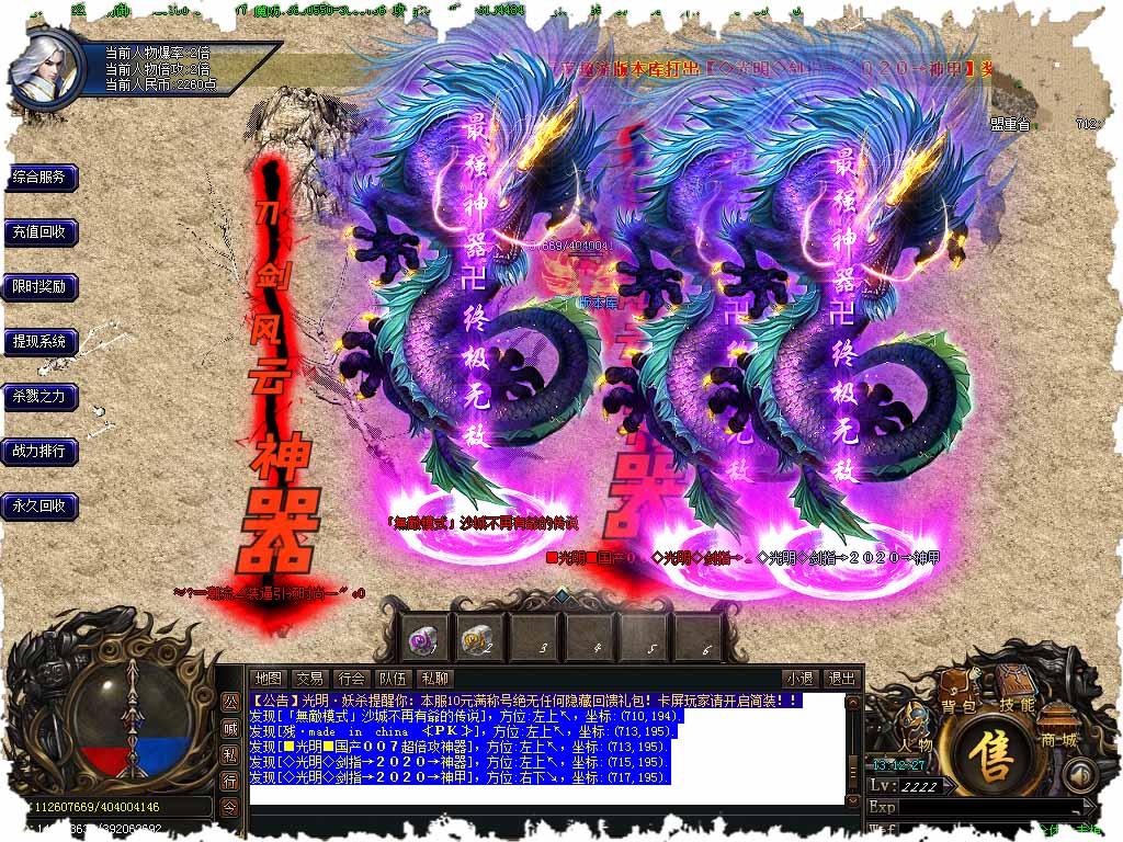 版本介绍:本服务器运营3年之久,正版授权,主推本服,每日宣传,只为保证人气。 版本介绍:此传奇版本10块满称号,上线送刀刀切割,无限刀,GK封挂,长久耐玩。 版本介绍:拿沙奖励多多,新增各种游戏打宝,有趣的活动等你参与 让你找回当年的感觉。 版本介绍:探索神秘地图和神秘boss,争夺神秘宝物,寻找秘境宝藏,持续不断更新,探索未知,享受乐趣,长久耐玩新鲜不断。 版本地址