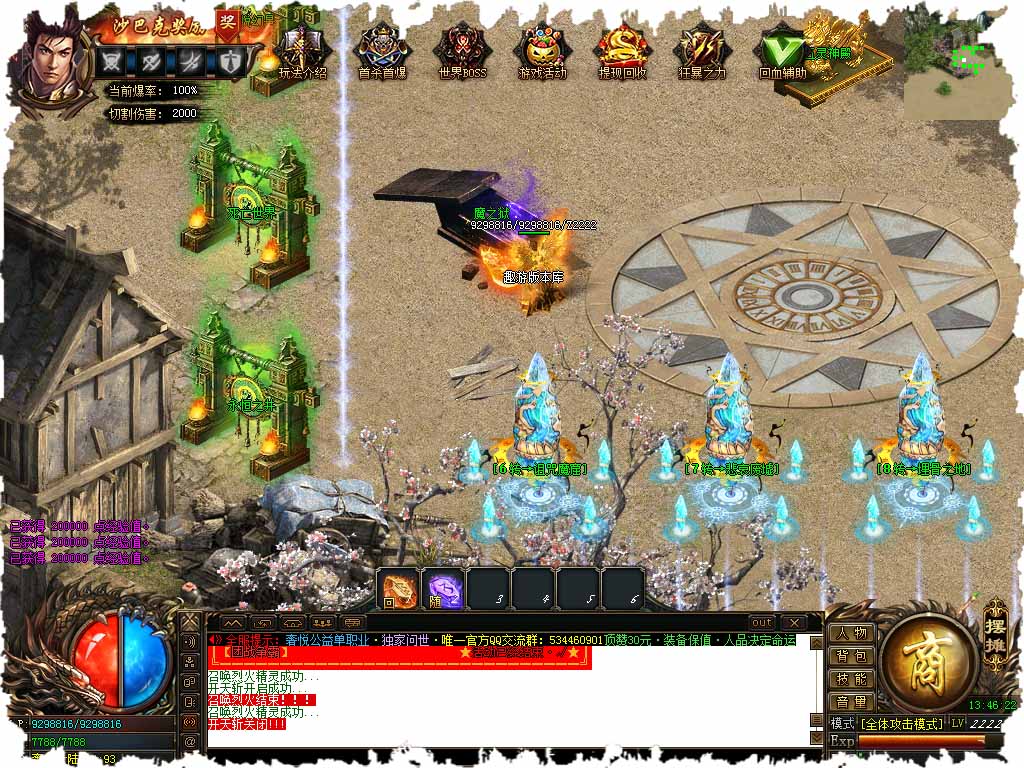 元宝比例:1=10000钻石,金币1=10金币,无任何额外的赠送比例。 版本特色:限时奖励,金币超高爆率,独家复古单职业奢悦复古,具体请进游戏体验。 版本介绍:赞助礼包+沙城捐献+狂暴让你快速起飞,下图直接干抢打首爆,无线刷各种材料给玩家,BOSS爆一切,偶尔会给你点小惊喜的哦。 版本介绍:散人玩家可双开,无线刷材料换金币、钻石,再跟小玩家组队下地图,只要你有时间。 版本介绍:此传奇版本转身优势明显,转身后加倍攻,同时在第二大地图中转生会多很多福利和精英BOSS,必爆实物和高几率爆回收件转身越高,福利怪各种BOSS都增多,打不完,根本打不完。 版本介绍:此传奇服务端切割带属性,怒火莲花、沙城捐献、称号都带切割属性加成,称号带百分比加成。 高级地图:一级称号.二级称号.时装.五灵神技.里面会刷相当可观的福利怪,各种高爆率BOSS,福利怪必爆实物,所有BOSS都有高几率获得。 版本地址