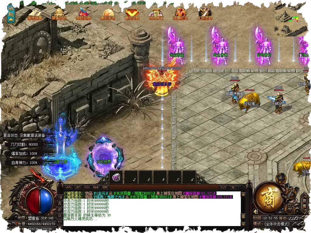 【版本介绍】新增项链洗炼能,项链放入洗练框,背包需要一颗以上BUFF鉴定石,BUFF共分为绿色,蓝色,橙色三种,橙色BUFF。 【版本介绍】低级项链BUFF 可转移到高级项链上。如果你对鉴定出的BUFF不满意可以重新洗练! 【版本介绍】世界BOSS必爆BUFF鉴定石橙色BUFF获得专属地图。可鉴定出三道橙色BUFF 三橙项链回收188元。 【版本介绍】新增降妖塔地图,主要怪物有上古异兽魔狮·圣山神尊。刷新时间这小怪30分钟,BOSS怪物60分钟,怪物爆各种高级装备,高级特殊,越高层爆的越好。需要50000元宝+八层降妖令(本层BOSS必爆)进入。 版本地址