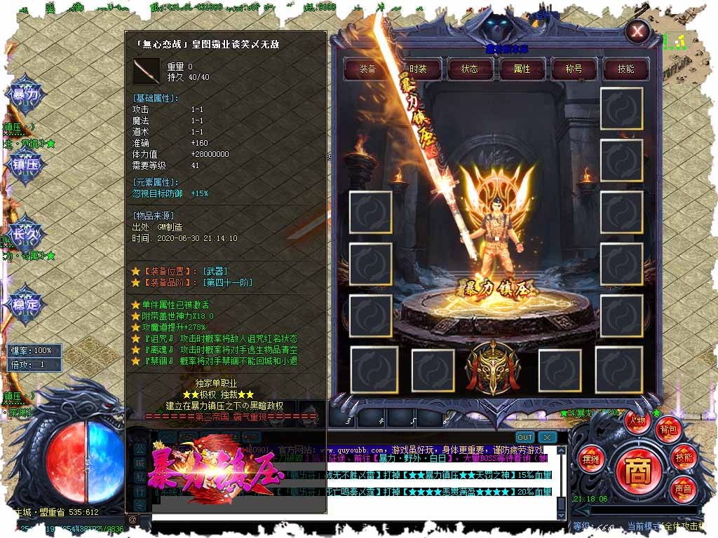 【版本介绍】开放项链加幸运功能,项链幸运最高+3,本服运九套触发最佳属性!运十套激活隐藏属性。 【版本介绍】新增幸运强化功能,强化幸运每次尝试需要收取1万游戏币,+2需要2万游戏币,+3需要3万游戏币,强化会失败,失败装备不消失,项链幸运值得拥有,1次强化终身受用。 【版本介绍】此传奇服务端新增装备提升功能,300-400级,每级需元宝200000颗,点击提升10级。 【版本介绍】新增神剑活动,进入地图后刷新拔剑NPC,鼠标左键开拔,本活动只限一人获得,靠的是眼疾手快,注意先打掉身边的,可安心拔剑,拔剑过程需20秒不可中断。 版本地址