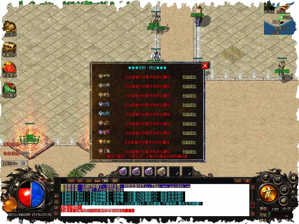 【版本介绍】此传奇版本新增装备分解功能,可以分解1-4转那些史诗、传承、罕世装备!分解装备有一定几率获得药品、材料印记、碎片、元宝和经验等。 【版本介绍】新增副本地图,冰雪副本地图共分1层、刷新各大BOSS,爆率与其他地图不同。此地图刷新本服最高王者级BOSS、熔岩巨兽BOSS、全新各种BOSS,BOSS极其厉害,攻击力非常高,必爆实物,如果装备不好的话谨慎进入,冰雪副本开放时间、开区三小时开放一个,一天共开放2次。 【版本介绍】为丰富玩家乐趣,新增冲级奖励功能,等级-60级获得1000元宝,共500名;等级-70级获得幸运盾,共400名;等级-80级获得幸运斗笠,共300名;等级-90级获得特戒+2,共200名;等级105级获得洗髓丹 *5,共100名;等级200级获得20W元宝,共30名;等级400级获得高级时装,共20名;等级500级获得50W元宝+500灵符,共10名。 【版本介绍】新增特殊装备火祭功能,盾牌、斗笠火祭后2个祭品消失,装备保留,会提升相应的装备属性,王者以上斗笠盾牌,+9以上特戒,注,三个同样的斗笠或盾牌或者特戒,火祭会消失2个,留下一个,火祭后的装备与非火祭的同样可触发2件套的套装属性。 版本地址