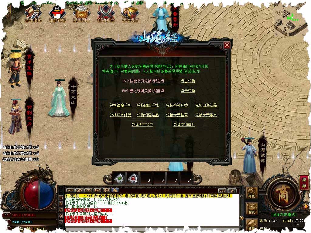 【版本介绍】山海经传奇版本游戏比例为1:2,无任何赠送。 【版本介绍】本F有以下几大原则:1.所有装备均有爆率,包括终极套,爆率全部看你运气和人品,不是打一只就必爆的那种。2.公平!公正!无比例3.最重要的一点,不吹牛,唯一的一点让散人有盼头,4.各色皮肤均可兑换新区,等级可以回收。5.沙巴克奖励丰富。 【版本介绍】本传奇服务端新增测试奖励记录功能,感谢您在测试区体验,我们将保存你在测试区所有的游戏点,等待正式开放时您将可以在我这里全部兑换,一定要在新区清理数据前来记录哦! 【版本介绍】新增冲级奖励功能,为增加游戏乐趣,本服特设该奖励,凡是前10名升到150级的玩家,系统奖励一本宠物技能石化之书。 【版本介绍】此传奇版本新增山海之力功能,开启后人物获得攻击力提升20%、生命魔力提升20%、伤害吸收提升20%、攻击速度提升2%,永久生效,小退下线及被怪物打掉均不受影响。 版本地址