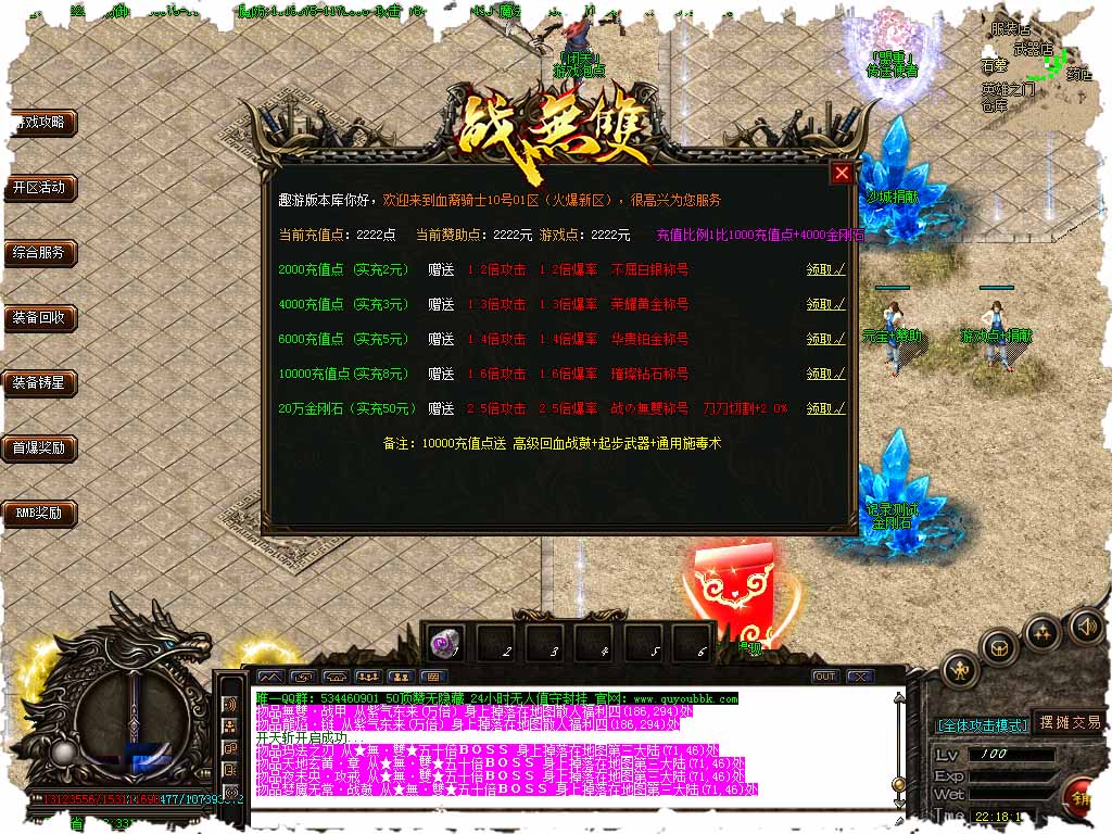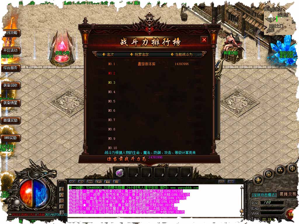 【版本介绍】上线赠送终极MAX超级加速,终极切割机,**全屏攻击随宠,无敌1刀疯狂斩。 【版本介绍】此传奇版本1刀999999999999999亿的HP,1秒999999999999999级! 【版本介绍】此传奇服务端每个活动都可参加,能够得到大量的游戏点或者等级装备提升,能进第二大地图就去那里打装备,游戏点足够也可以直接进入终极地图。 【版本介绍】优化散人发展速度,新增四个活动三个活动全为散人、开放全部回收功能,优化信息提示、爆率、NPC显示、NPC位置和优化PK体验等功能。 【版本介绍】新增2套装备装备,战歌套,离火套,新增4个活动分别为天降珍宝、游戏点活动、煮酒论英雄散人福利BOSS、群雄涿鹿等。 【版本介绍】超高爆率的一款版本,带上您的兄弟一起来,挥洒青春,喝最烈的酒,操最好的服!! 【游戏特色】沙巴克攻城,额外奖励388,虽不多,但是PK无限!等你来战!书写不一样的传奇,您准备好了吗? 版本地址