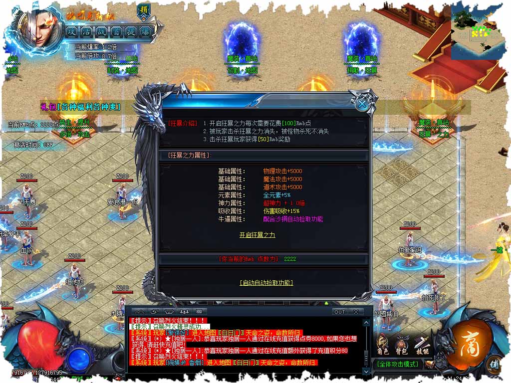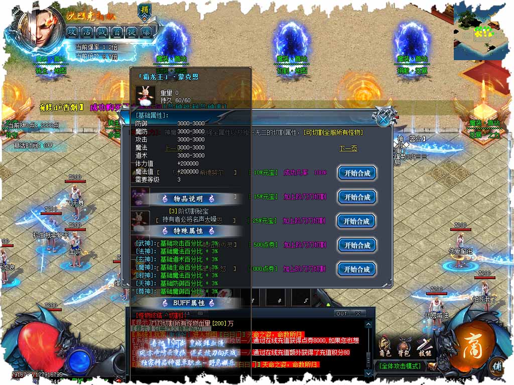 【版本介绍】新增潜世遗宫地图,属于称号地图,达到相应称号即可进入,里面刷新大量5-10档怪物,部分高级怪物,大量福利怪物。刷新时间20-60分钟,怪物越强,数量越,刷新时间越慢。 【版本介绍】此传奇服务端不关闭爆率,所有装备看运气,时间决定一切! 【版本介绍】积分满1500,另外赠送600真实积分,每名角色只可领取一次! 【版本介绍】新增太初之力属性,提供超强全属性以及独一无二的冰冻属性,每阶额外获得[2%]伤害吸收。 【版本介绍】新增冰冻属性功能,只针对怪物触发,后期高等级怪物以及世界BOSS只吃冰冻不吃定身,每升级一阶需要上阶太初之力+对应游戏点,最高10阶,终极太初额外[增加攻击速度]。 【版本介绍】新增装备幸运功能,1.只可强化项链,武器不可强化!2.需要强化的项链必须佩戴在装备栏,否者无法强化! 版本地址