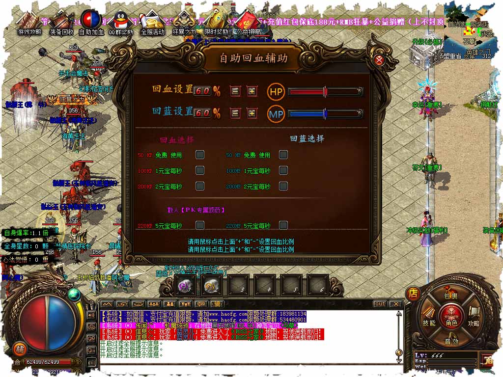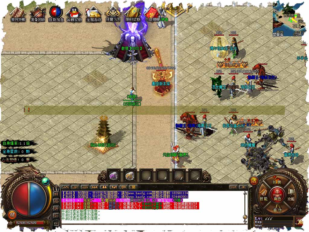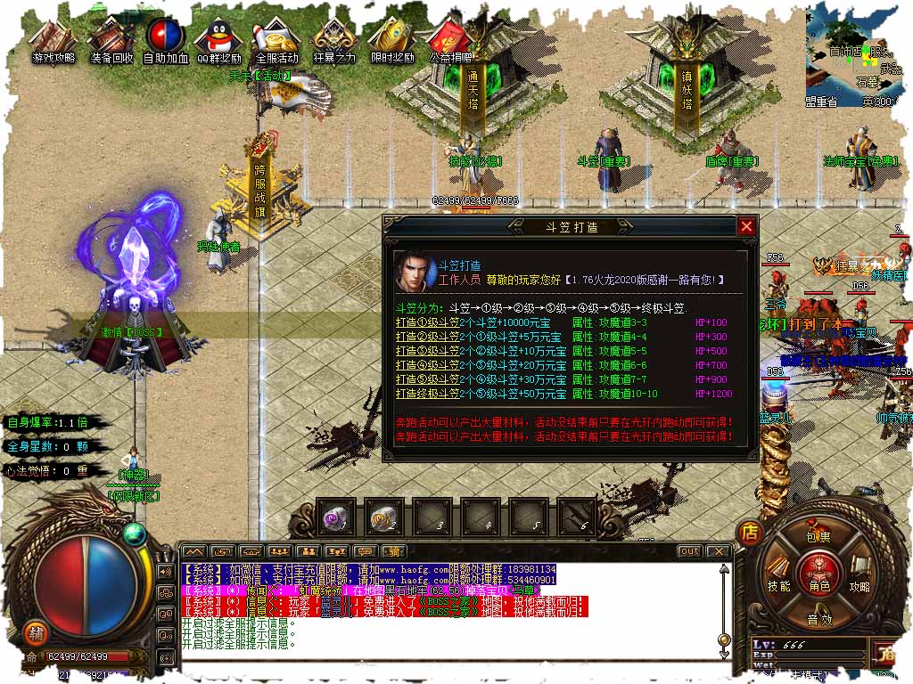 【版本介绍】本传奇版本技能可合成,在技能使者那里可以免费合成高级技能!魔窟是本服唯一出技能书的BOSS,千万不要错过。 【版本介绍】新增超级神塔,神塔前6层无怪,100层BOOS必爆1样至尊火龙+火龙剑甲[金],新区开区后每隔3小时一次,共可以爬3次! 【版本介绍】神塔总共100层,首次攻沙后每天13、19、23点定时刷新!100层的BOSS被打掉后或活动开放1小时后活动关闭,切记开启读条时就扣除元宝,确保没人打你在去点NPC哦! 【版本介绍】神塔1-40层需要 1万元宝进入,100%掉落1元游戏点!41-60层需要 2万元宝进入,100%掉落2元游戏点!61-80层需要 3万元宝进入,100%随机掉落战神装备一件!81-99层需要 5万元宝+【黄金赞助】进入,80%随机掉落火龙装备一件,顶层终极BOSS被打掉后,地图将关闭,最后一层100%随机掉落至尊火龙首饰一件+赤金火龙剑甲随机一件。 版本地址