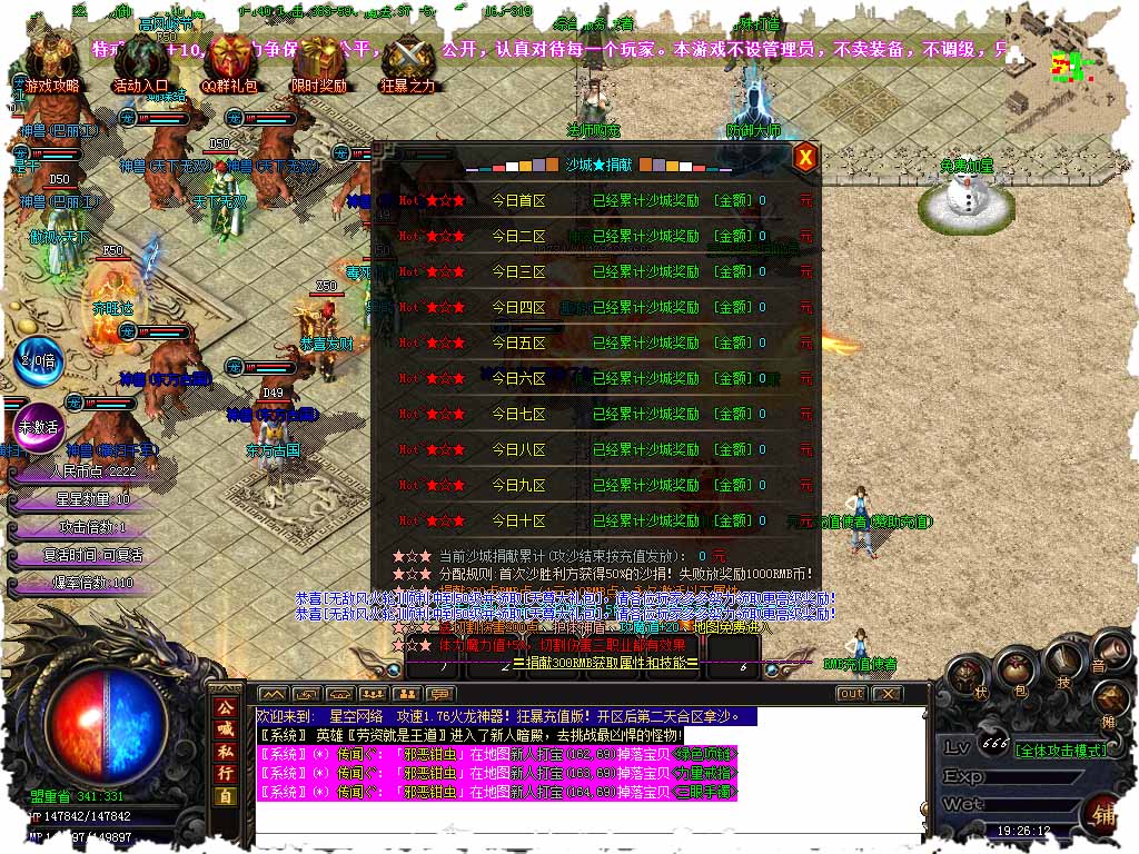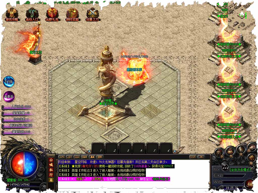【版本介绍】攻速火龙全新季度,为了散人玩家考虑,此传奇版本所有中高级地图都刷新福利BOSS,福利BOSS刷新会有提示,大家一定要前面,他可是会爆出大量游戏点。 【版本介绍】本服每天开放8个新区,开区后第三天合区拿沙,越晚的区爆率越高。 【版本介绍】星空币在地图爆率极高,最高可以掉落50-100,所以玩家不需要担心不够用! 【版本介绍】神器装备可进入100地图中打,散人打8W血量的BOSS,HP越多的BOSS爆率越高! 【版本介绍】本服无任何隐藏!打到游戏点兑换也可以领取,散人也可以逆袭。 【版本介绍】大家关注的神魔晶石,冰雪之地,地图就开始爆率很高了哦!越后面爆率越高! 【版本介绍】转职后,玩升级领取的开天斩等技能转职后自动替换成你当前的职业,无需担心! 【版本介绍】本服所有装备都是怪物爆出,耐玩简单,很多没介绍到的玩家慢慢体验吧,此传奇服务端是特色版,不像传统复古那么累,也不会出现秒人现象,传奇讲究的是耐心长久,想一天终极的玩家请绕道。 【版本介绍】前期建议玩战士、法师,法师打元宝快!本服三职业全部平衡,没有强弱之分,战士:后期PK得王者,前期散人不建议玩,后期厉害。道士:前期打宝必备职业,不同等级召唤不同神兽。法师:可以召唤强力的随宠,碾压各种BOSS,配合道士打宝更带劲。 【版本介绍】各大地图BOSS都会爆出赤月、雷霆、王者、火龙、龍吟、毁灭等等一系列,更多BOSSS请自己体验吧。 版本地址