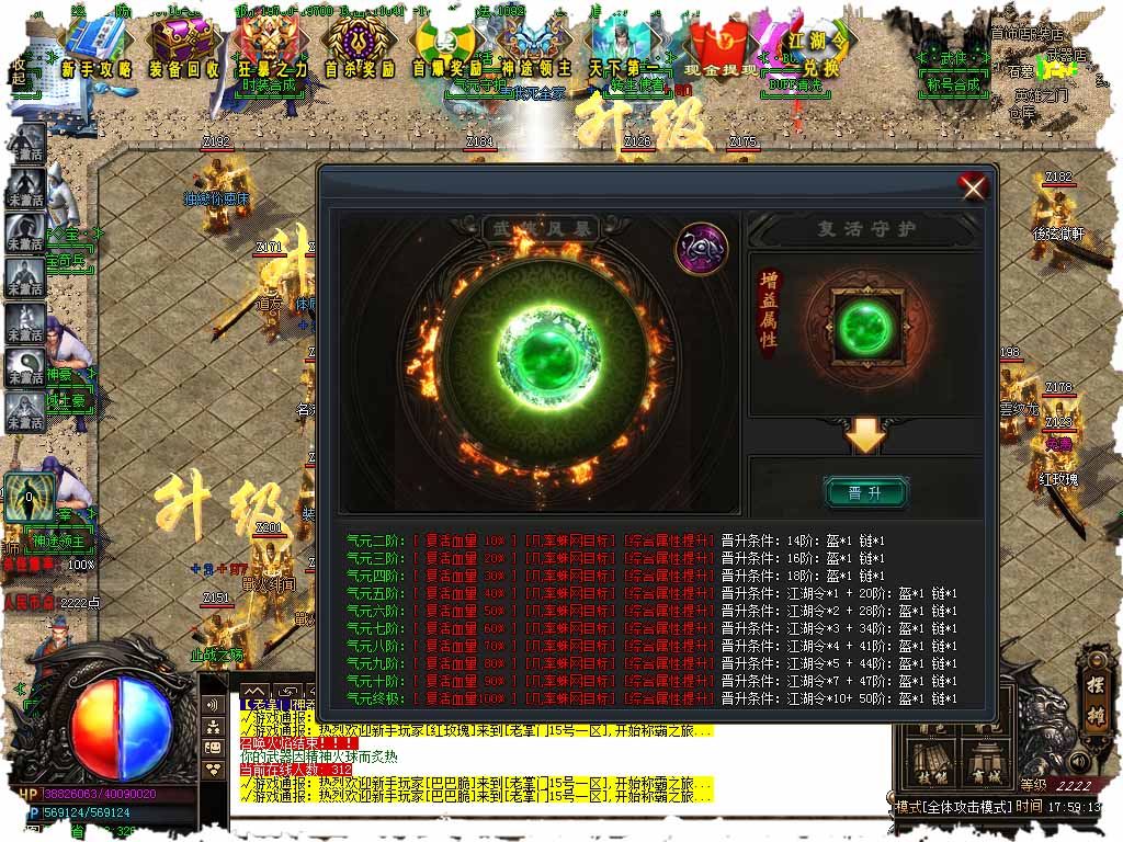 【版本介绍】新增超级神技功能,释放神技可使周围所有敌人击退5步之外,周围所有敌人受到神技内力HP会减少。同时触发绚丽效果,群殴,攻沙超牛,CD时间180秒。领悟条件人物拥有七重升仙+天道无敌+108游戏点+108江湖令。 【版本介绍】冲满200以上(包含200)的账号可转移到任何新区。 【版本介绍】新增元素功能,元素觉醒后攻击:200--200;魔法:200--200;道术:200--200;体力:100000;魔力:100000;元素属性:暴击几率+5%;元素属性:攻击伤害 +5%。 【版本介绍】本服最高500级,450-500级可直接提升,需要元宝币30000+江湖令*1个。 【版本介绍】传百年之久的‘霸天连环斩’地图重现江湖,霸天连环斩BUFF,必爆 - 随机一件(倍攻1.2倍,1.4倍,1.6倍,1.8倍,2.0倍,2.2倍首饰。此地图主要怪物:小怪、小型BOSS、中型BOSS、大型BOSS,爆率指数可爆所有物品,人品决定一切,进入条件:等级500+升仙三层或以上。 版本地址