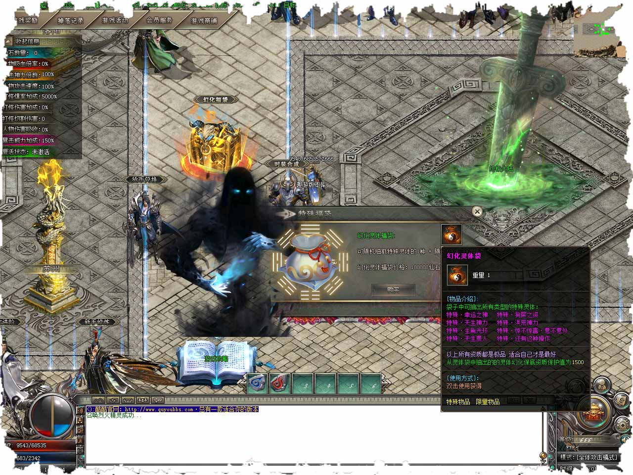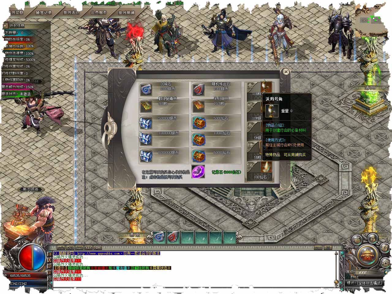 【版本介绍】:在传奇版本中的神秘大使可以开启指定装备的经验条,消耗材料注入特殊装备的经验值!特殊装备经验值满可直接升级至装备下一阶级属性加强。 【选择装备】:选择你需要注入经验的装备。 【使用介绍】:穿戴此装备.点击对应材料即可为指定装备注入经验值! 【版本介绍】:众神殿lv1<全属性100-100 HP+1500 倍击+5%。 【版本介绍】:众神殿lv2<全属性200-200 HP+3000 倍击+10%。 【版本介绍】:众神殿lv3<全属性300-300 HP+5000 倍击+15%。 【版本介绍】:众神殿lv4<全属性400-400 HP+8000 倍击+20%。 【版本介绍】:众神殿lv5<全属性500-500 HP+10000 倍击+30%。 【版本介绍】:听说在永生某个地图的狮墩下有新世界的入口!!!我相信你可以去[一]试.... 【版本介绍】:我可以带你进入通往神域的路,但能否经得起考验取决于你是否足够强大,如果你准备好了.那就出发吧!徒步穿过通道即到达神域!提醒:建议你把重要的物品先存入仓库!并准备好记录石记录坐标。 版本地址