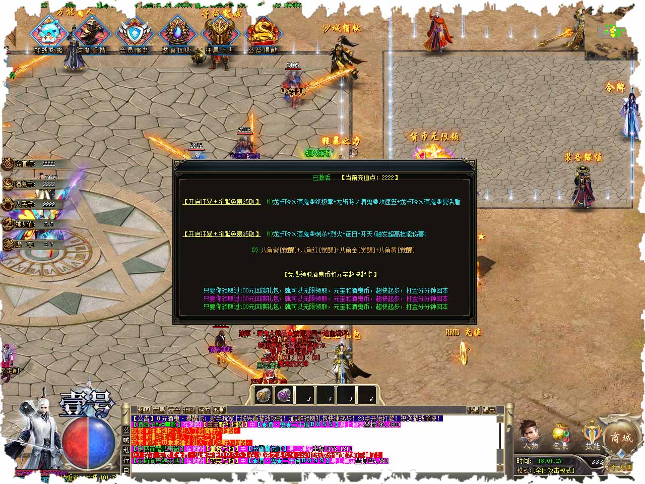 地图介绍:乱舞深渊地图主要怪物 :中华神龙 金猪宝宝 60分钟刷新一只,刷怪时间:30分钟刷新 百倍 终级BOSS。 爆率介绍:本服爆率超高,配合赞助、公益、狂暴、捐献、爆率将得到最大化。 进入条件:人物91级以上,免费进入。 侠你没有佩戴暗黑上三无法升级该称号,望勤加**!或者没有开启捐献狂暴! 提升至91级需要等级90级,需要扣除600000酒鬼币,攻击永久提升0.05倍。 等级高于对方使用十步技能有几率定身对手,获得对方黑屏BUFF,同时免疫黑屏BUFF。 《天启镜》升级需要:88级免费提升,增加20万生命值,境界提升:一次提升,没有几层几层,点一下就下一级境界。 土豪之地地图,进入此地图额外爆率增加7.5倍,进入需要110级免费进入,地图爆率高,打起来轻轻松松。 版本地址