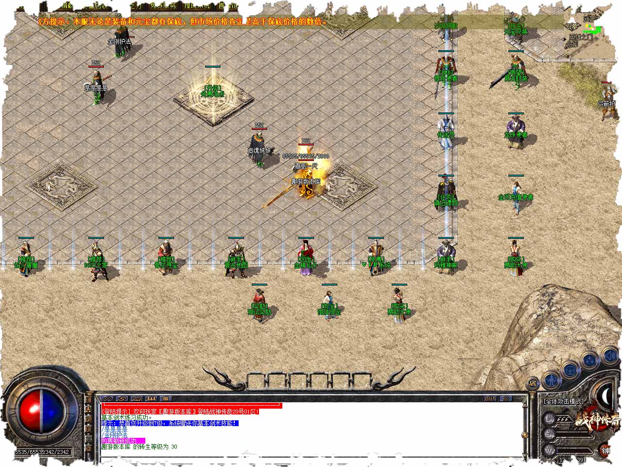 【战神传奇】:本服为公司运营,纯广告散人服,长期开放,稳定更新。 【官方提示】:本服无论是装备和元宝都有保底,但市场价格肯定是高于保底价格的数倍。 【战神传奇】:六年底蕴,专注复古,复古小极品+5版、无泡点、无合成、无抽奖,只为找回最初的激情 重拾昔日的热血。 【官方提示】:本服禁止开一切辅助软件,包括27代理、47代理,绝不姑息外挂,违规者一律封号、封IP、封机器码,请大家珍惜游戏环境。 【郑重提示】:请小心骗子,交易一定要经过担保,否则客服概不负责,请不要将您的帐号和密保资料告诉他人,以免装备物品被盗。 【道士宝宝】:50级召唤白虎,54级召唤2只白虎,56级召唤2只白虎王,后期道士不再乏力。 【关于职业】:传奇三职业本无强弱之分,等级和装备决定后期强弱,喜欢什么职业就玩什么职业,别说某职业弱,究其原因是你不够强大。 【装备介绍】:本服装备珍贵,且爆率真实,魔龙教主爆一切,开天凤天系列均可在游戏中爆出,+3以上的尤其珍贵。 【版本介绍】:本服无论是装备和元宝都有保底,但市场价格肯定是高于保底价格的数倍。 【郑重提示】:游戏中喊话,诽谤、诋毁服务器声誉、散播谣言,造成不良影响,将永久封ID,绝不手软。 版本地址