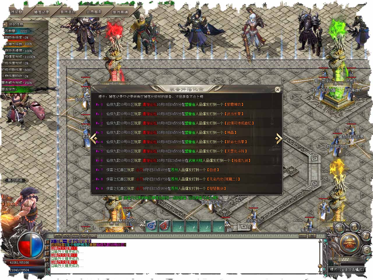 版本介绍:一.225米仙石满会员(游戏内查询属性)。二.300米仙石满佩刀+(爆率 切割 魔法盾 等级 攻击 生命 传送功能)。三.300米仙石满法宝(百分比切割超级厉害,不多解释),四.300米游戏点满沙捐送半月弯刀,超牛属性(游戏内可查询)。 版本介绍:全满仙石需要 825米(仙石测试区冲送20%玩家自己算一下),游戏点无比例,无赠送。 版本介绍:上线先去打点银币多买随机 开区15分钟后 进随机夺宝地图可以飞到砖石会员 (一小时内共4次)总有一次会是你。QQ礼包领了 送3小时满攻速 赶紧去打限时奖励 获取仙石,然后升级会员领取仙石和银币。 版本介绍:开启狂暴就可以去狂暴地图打福利BOSS爆游戏点和冲点(如果你连10块钱都不想花那就打材料出给老板)。 版本介绍:转生提升等级(打怪不提升经验)。使用仙石在土城下方点击佩刀升级一直升级到不能升级为止。使用银币在土城下方点击新手修炼然后升级驱魔术直接升满。剩余的升级击PK术能升级多少升多少。银币不是很多的情况下特殊不用升级(可以打出专属特殊)。 版本介绍:开上狂暴,捐献,加入第一行会就可以去打怪了,土城新手训练是必须升级的(爆率可以最后再弄)。 版本介绍:第一页称号一大地图(苏州,洛阳,燕京,域外)均可爆出,称号卷轴对应怪物名字。第二页称号一大地图内任何下层地图都可爆出。第三页称号去修真界地图均可爆出。 版本介绍:称号卷就去土城上面升级称号属性(称号增加基础全属性,体力素,暴击伤害,神力,固定切割),有丹就去转生,转生增加对怪的额外伤害。,合成地方在装备的最下面有地图和坐标。 特别注明:第一大地图内只要带坐标可合成装备必须都合成,第二大地图合成装备都需要第一大地图的合成品。终极装备需要二大地图合成+尤娜专属装备 群内文件有装备合成表请玩家自行查看。 版本地址