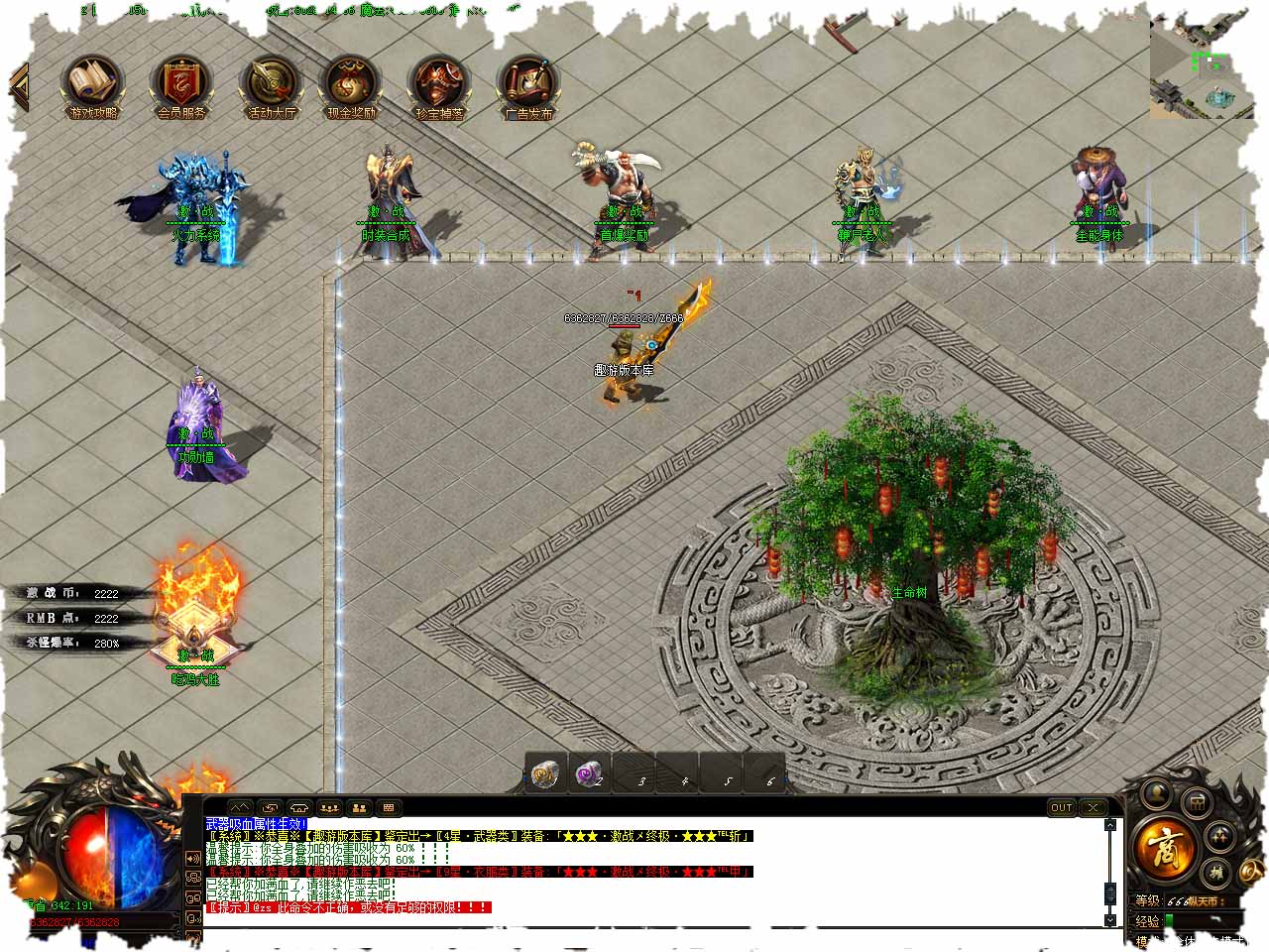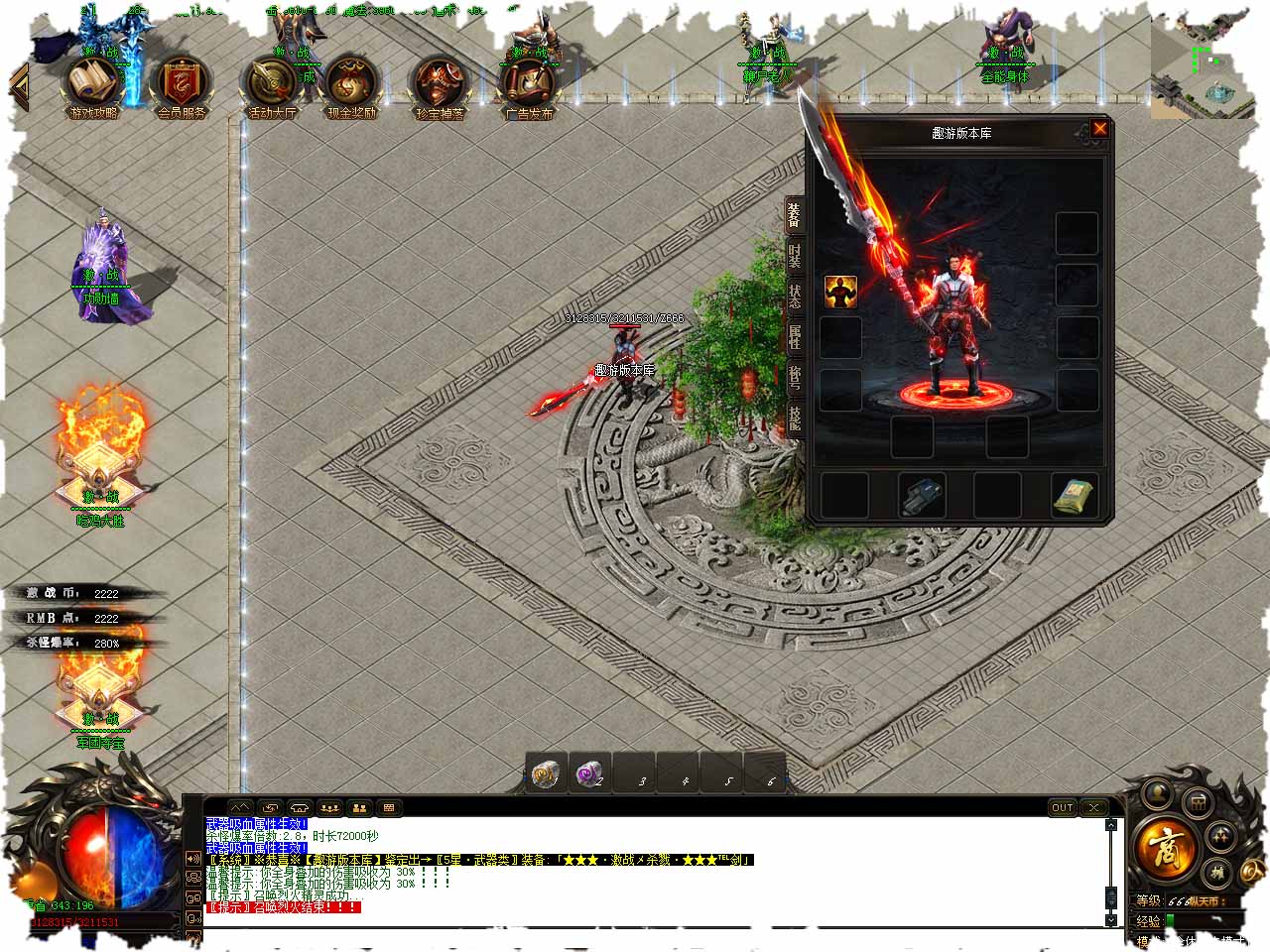 超级福利:开通沙城捐献,必须把左边魂师礼包领完才能领取沙城捐献。额外赠送打怪刀刀切割1%!捐献属性永久生效! 游戏说明:本捐献奖金作为沙城奖励,捐献需要网站充30!游戏打也可以捐献! [激活] 体力增加30% 魔力增加30% 全属性增加2000。 [激活] 游戏免验证 + 自动回收装备。 [属性] 刀刀切割1%,PK爆率+10%,打怪爆率+50%。 [捐献获得永久属性加成],附加属性:刀刀切割怪物,本服第3天下午12点合区拿沙!充分的发展空间! 捐献需要RMB点,RMB充值请在土城345,337坐标找RMB充值使者充值或者领取。 我这儿有一门上古的手艺,可穿梭时空,任意传送,我可以免费为你打造“传送戒指”,但是可要消耗大量材料! 深渊魔域地图介绍:火力达到20000以上----限时1小时回城!等级480级以上+战斗力20000+激战币100进入地图。 版本地址