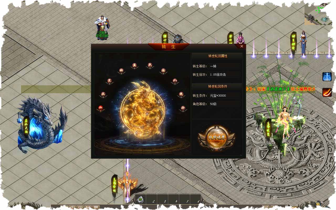 元素属性开启条件:3000点券+30帝王觉醒石,击打者获得2500点券+帝王觉醒石*25。 高级地图刷新时间:顶级Boss.80分钟丶终究Boss.130分钟,刷新BOSS : <道神丶魔王丶上古凶兽丶不挂神王,必爆BOSS : <至尊之地BOSS丶江湖逍遥BOSS丶只手遮天BOSS/>怪物掉落 : 爆率贼高,地图说明>: 合区后关闭。 神龙护体时一种激发技能,当神龙护体激发那一刻,可以吸收敌人或者怪物给自己造成的30%攻击伤害,技能使用间隔:10秒 技能触发几率:20%. 技能有效时间:30秒 护体减伤比例:30%,神龙护体获得条件:等级达到450级。 天地为炉,万物为铜,阴阳为炭,造化为工。本尊已有万年未见帝王之心,拥有它可以横扫诸天神魔。 亦可让你出神入化,高人一等!!等级突破条件,需要一定的帝王觉醒石。 ↓↓六新衣服↓↓ 困惑殿堂进入条件:收费五万金币刷新BOSS:暗之双头血魔刷新时间:三十分钟是否有怪STR(A223)BOSS掉落:男战士衣服,法宝碎片215桃园之门,坐标:94,处可免费进入困惑殿堂坠落坟场进入条件:收费五万金币刷新BOSS:暗之黄泉教主刷新时间:三十分钟是否有怪STR(A224)BOSS掉落:男法师衣服,法宝碎片,215沃玛森林,坐标:36处可免费进入坠落坟场深渊魔狱进入条件:收费五万金币刷新BOSS:暗之双头金刚刷新时间:三十分钟是否有怪STR(A225)BOSS掉落:男道士衣服,法宝碎片,215沃玛森林,坐标:215312处可免费进入深渊魔域地狱烈焰进入条件:收费五万金币刷新BOSS:暗之骷髅精灵刷新时间:三十分钟是否有怪STR(A226)BOSS掉落:女战士衣服,法宝碎片,215比奇省,坐标:8474,处可免费进入地狱烈焰钳虫洞穴进入条件:收费五万金币刷新BOSS:暗之沃玛教主刷新时间:三十分钟是否有怪STR(A227)BOSS掉落:女法师衣服,法宝碎片,215白日门,坐标:3325处可免费进入钳虫洞穴亡神殿进入条件:收费五万金币刷新BOSS:暗之虹魔教主刷新时间:三十分钟是否有怪STR(A228)BOSS掉落:女道士衣服,法宝碎片,215封魔谷,坐标:218处可免费进入亡神殿。 温馨提示:游戏主打BOSS,只要是BOSS均可掉落终极装备散人逆袭。 版本地址