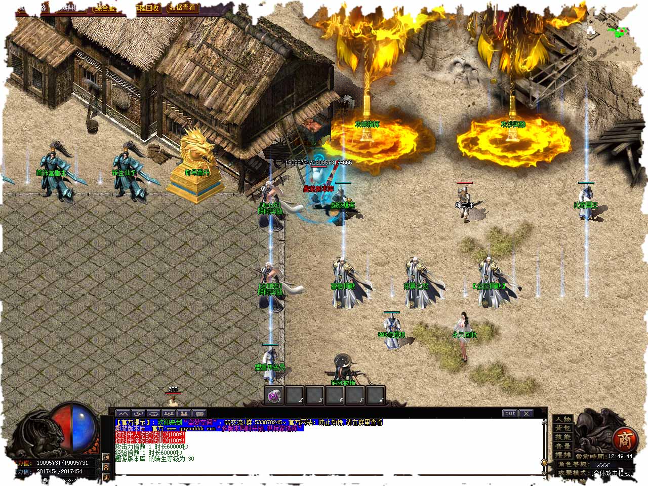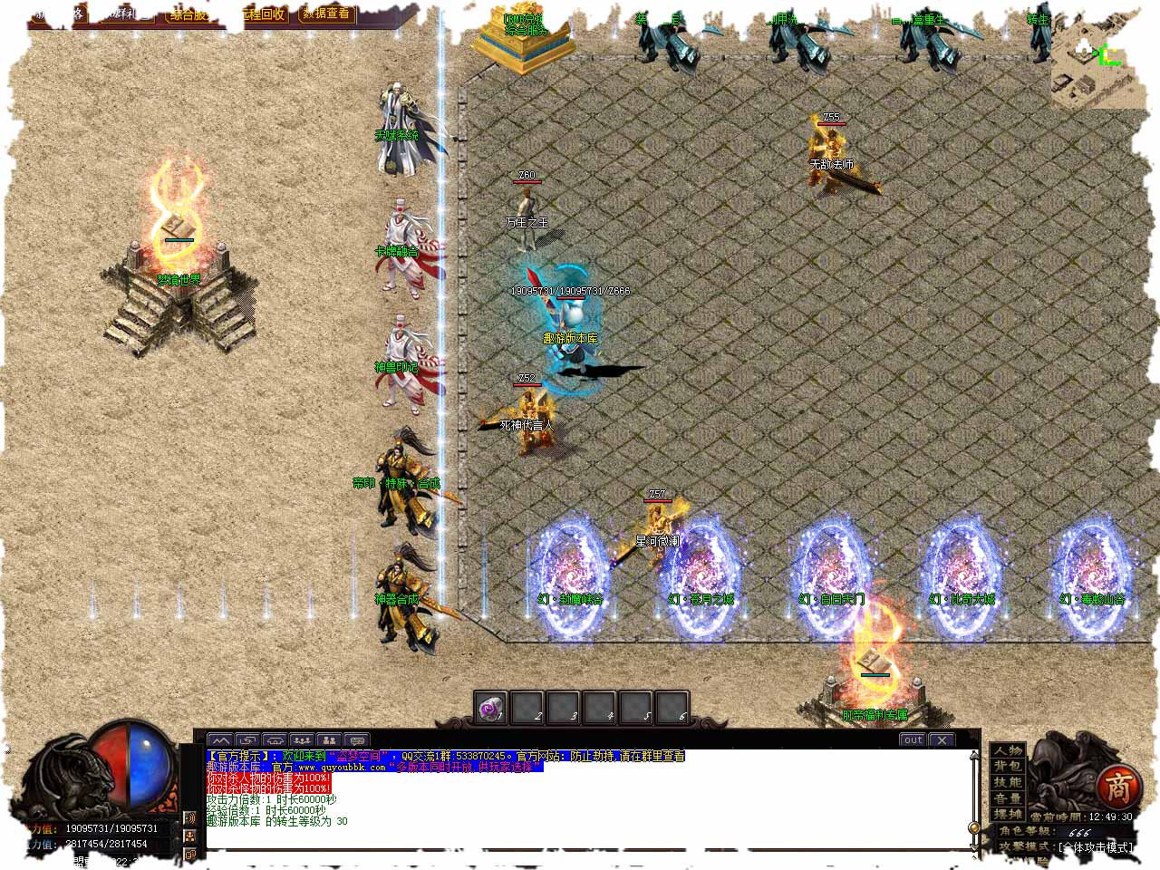 ============================================================================ 充值比例 金刚石1比200 RMB 1比10 游戏非常好玩2大陆爆一切,限时奖励RMB,是为了增加大家玩游戏的乐趣,不要一味打金而忘记游戏的初衷!! ~ 怪物简装 人物简装 功能开启 都是这个~~这个按键! 至尊赞助50块免费领取 散人可通过打金刚石购买 游戏货币好打 RMB也可以爆出 开狂暴就可以自动捡取了!!!开狂暴就可以自动捡取了!!!开狂暴就可以自动捡取了!!! 建议开沙捐配合狂风戒指 狂风戒指需要18+68RMB点 **狂风戒指 附带百分百麻痹 以及传奇最快攻速 打金必备!! ps-- 佩戴狂风戒指需要小腿 才出发最高攻速!!!!! ============================================================================ 游戏步骤地图走法顺序 幻·盟重土城---幻·毒蛇山谷---幻·比奇大城---幻·白日天门---幻·苍月之城---幻·封魔神谷-2大陆左边城-2大陆右边城-3大陆出生地-3大陆主城梦境-3大陆右上角海岛新城- 幻·盟重土城---幻·毒蛇山谷---幻·比奇大城---幻·白日天门---幻·苍月之城---幻·封魔神谷-2大陆左边城-2大陆右边城-3大陆出生地-3大陆主城梦境-3大陆右上角海岛新城- 幻·盟重土城---幻·毒蛇山谷---幻·比奇大城---幻·白日天门---幻·苍月之城---幻·封魔神谷-2大陆左边城-2大陆右边城-3大陆出生地-3大陆主城梦境-3大陆右上角海岛新城- 175以后升级路线 175-180级 2大陆等级突破NPC 180-186级西楚霸王 186-191级 2大陆坐标(439 397) 升级勋章也是这个路线 幻·土城开始-幻·毒蛇-幻·比奇-幻·百日-幻·苍月-幻·封魔-2大陆传送点-新的梦境-3大陆出生地-3大陆新梦境 2大陆左边地图坐标 修罗界界 103 480 超级战场 161 664 宇宙战场 225 396 金庸武侠 321 574 古龙之地 64 305 玄幻空间 221 161 漫威世界 351 87 互联网络 407 232 召唤师峡谷 121 168 拳皇战场 291 260 三十三重天 247 310 新天地娱场 67 640 动漫大峡谷 77 33 百慕大三角 196 50 ------------------------------------------------ 2大陆右边地图 进2大陆右边条件 需要186级 封神的世界 597 59 八纬度空间 624 130 祖龙的禁地 629 319 玛法世界 603 572 残破的西方 504 464 上帝的禁区 439 401 昆仑山深处 439 405 流浪玄都城 439 409 ---------------------------------------------------------------------------------------------------- 3大陆地图 400 460 末日的第七城 295 218 盗墓笔记 295 218 盗墓笔记 533 901 梦境副本 628 199 挂神界 316 523 极寒之水 407 770 画江湖 504 598 石墓 629 585 藏宝阁 579 330 迷雾森林 757 267 哈利波特 790 668 加勒比海 734 172 祖玛寺庙 740 405 虚界 166 922 斗破苍穹 322 632 玄界之门 587 418 剑来 161 536 新的梦境传送员 529 855 梦境岛传送员 669 779 梦境岛传送员 724 716 梦境岛传送员 744 647 梦境岛传送员 那些不知道装备哪里爆的看这里!我全部给你写明白,坐标地点,什么地图爆什么!!! --------------------------------------- 挂神界BOSS爆终极武器 虚界BOSS爆终极衣服 梦境副本爆12格 祖玛爆终极左戒 石墓爆终极左镯 藏宝阁终极头盔 哈利波特爆终极斗笠 盗墓笔记爆终极项链 画江湖爆终极右指 万族之地爆终极勋章 末日第七城爆终极靴子 迷雾森林爆终极腰带 极寒之水爆终极右镯 梦境BOSS爆破复活 地图紫色标准怪物爆背包装备 剑来刷新全部武器怪物,加勒比海刷新爆衣服怪物 ----------------------------------------------------------- 登录器闪退打不开 用360系统急救箱急救,第一次进入游戏读取补丁黑屏一会就好了耐心等待。 版本地址