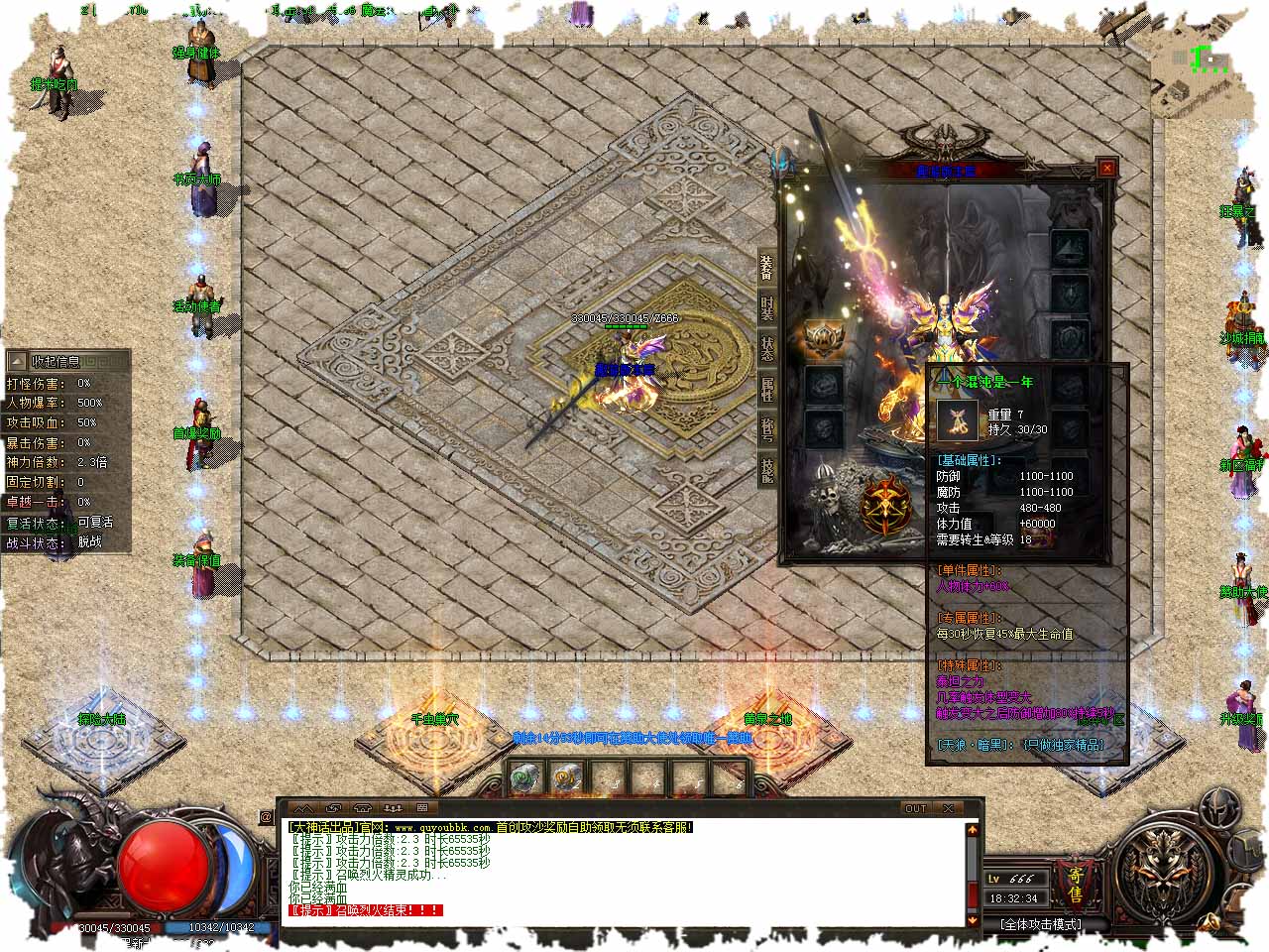 【版本介绍】:二十一重转生,条件:转生圣石x10+5000元宝,赠送:神力倍数x1.40倍。本服玩法简单易懂无坑,所有装备全部靠打,进阶强身,伤害减少+1%。 【当前称号】:“唯吾独尊”【下级称号】:“末日霸者”。 【称号属性】:体力值基数+12000,全属性+32%,伤害吸收+32%,固定切割+4000。 【升级材料】:称号证明 x30 + 15000 元宝。 【转生系统】:转生属性:2.5倍神力攻击,对怪对人都有效,[转生条件]:<转生圣石 x20 + 80000元宝。 【版本介绍】:废弃古墓,【地图怪物】:白骨精灵、白骨战将、挂灵法师,【刷新时间】:<小怪10分钟、BOSS60分钟,【进入条件】:免费进入.12小时后关闭此地图。 【测试系统】:测试区自动记录(首爆奖励)所获得金币和元宝。正式开区后,测试区记录的(金币)可以再此领取。测试期间请勿告诉别人账号,否则测试福利被别人领取概不负责! 【活动系统】:新区开放40分钟后开启,主城安全区随意跑动获得大量宝物,新区开放80分钟后开启,活动地图掉落大量宝物,时间到了即可捡取,新区开放每180分钟开启,新区全天开放,无论新老区永久开放,每天22:30,必爆高级,必抢BOSS。 【重置系统】:如果你觉得装备的附加属性不够强大,或者想尝试换成其他的属性,那么我可以给你帮助,我将随机赋予你任何属性但是我需要收取,10w金币,请将装备放入右边的框内一起重置。 版本地址