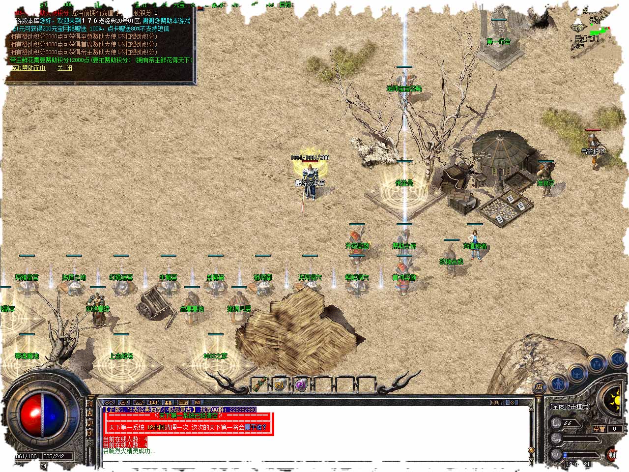 【游戏介绍】1.76老经典·复古小极品传奇版本-刺PK加强-烈火加强-爆发伤害力高。 【游戏介绍】2021独家1.76复古老经典小极品版本,市面独此一家! 【新手指导】进服玩法师去自助练级里面升级到49级转职道士就可以打全服BOSS了 【练级简历】无泡点 玩家打BOSS或去自助练级刷经验蜜蜂配合双倍加珠子升级)! 【游戏介绍】使用最新定制版登陆器,封一切加速外挂,无视任何脱机辅助! 【装备回收】本服装备完全靠打,高级装备回收详情进服土城左上角进行查看! 【游戏介绍】刺PK加强。烈火加强!爆发伤害力高 法师46级可召唤天师虎卫 道士59级可召唤三只护卫。 【本服公告】本游戏需要点耐心,一天想满级想终极的,趁早OUT! 版本地址