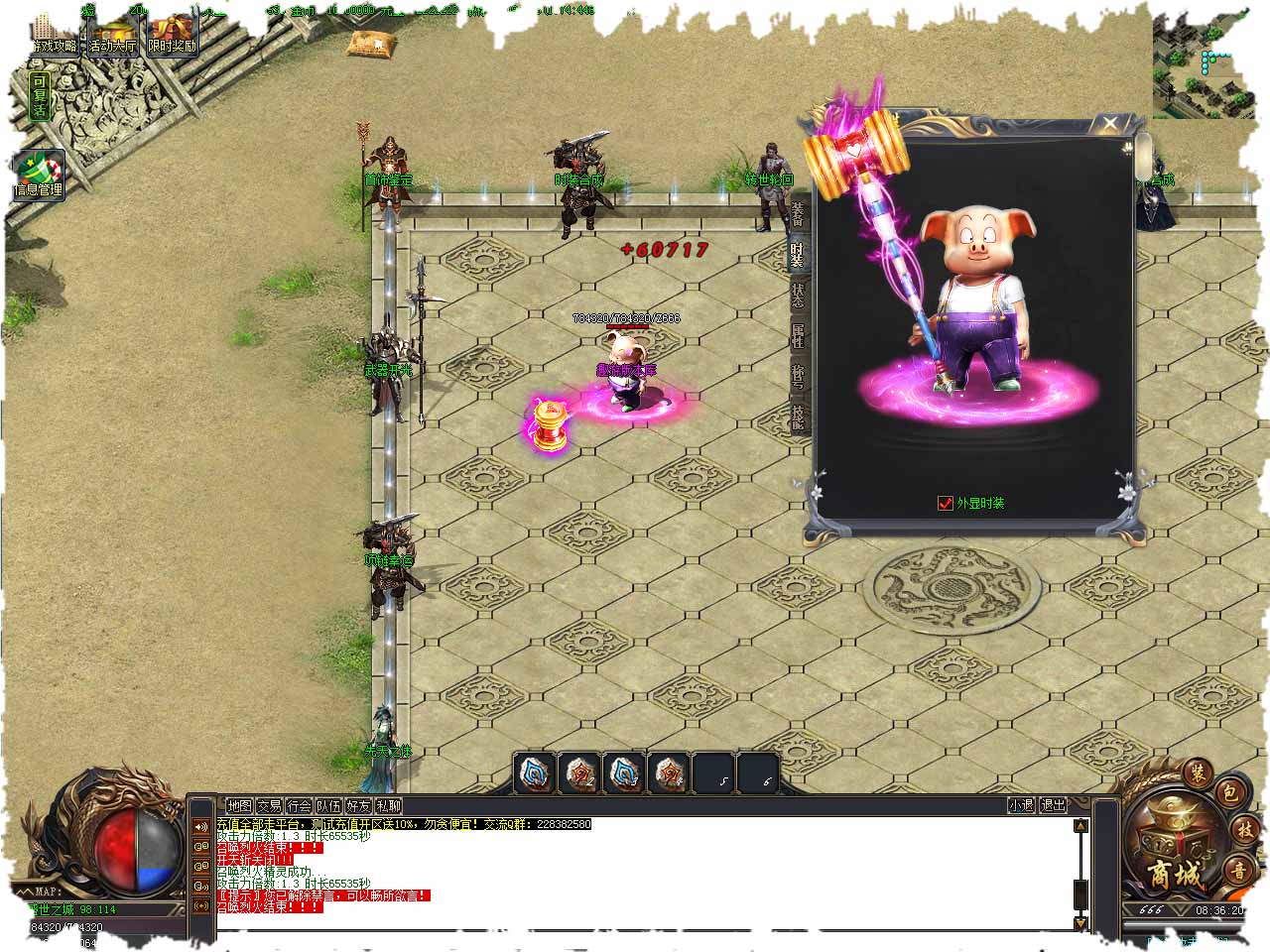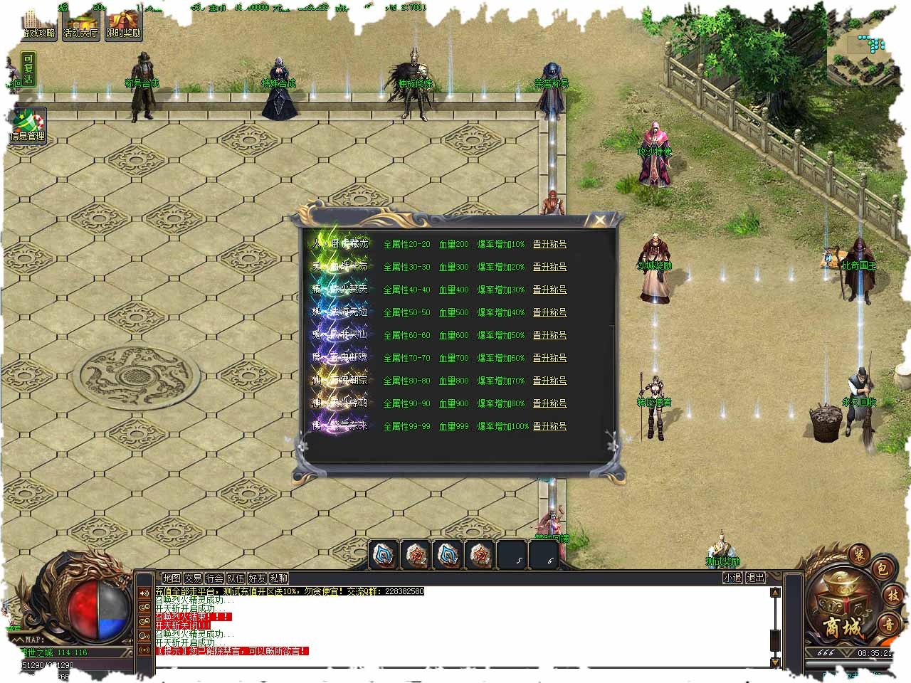 全属性111-111 血量1111 爆率增加120% 暴击 + 5%。 人族秘境:亲爱的勇士,这里面居住的人族的大能强者.也是这个世界的守护神,他身上携带了原始大陆所有的装备,而且他自身也具有强大的装备 进入要求:进入必须需要五人以上组队.或者自身攻击力大于4999,不然的话进入也是被挂掉。 称号说明:圣之荣耀称号全属性155-155 血量1111 爆率增加250% 暴击几率 + 25。 强化装备需要材料:[精灵之心.恶魔之心.人族之心.龙之真血.龙之鳞片.龙之巨齿] 装备最高可强化至:<[9星] (面巾,时装.无法强化) 强化后的装备可以免费随意转移 请将需要强化的装备放在这里 [鼠标移动此处可查看强化加星获得属性] [装备强化属性介绍]: 全身强化1星触发最大生命值 + 10% (加成最终生命值) 全身强化3星触发最大生命值 + 15% (加成最终生命值) 全身强化6星触发最大生命值 + 20% (加成最终生命值) 全身强化9星触发最大生命值 + 30% (加成最终生命值) 测试区打到限时奖励获得的盛世币,元宝,正式开区可在我这里领取。 测试期间系统将自动为你记录限时奖励,无需任何手动操作! 测试区打到的盛世币正式开区返还50%,元宝返还100%。 合区会清除所有人的RMB捐献数量,首次捐献最低需求300RMB,获得称号:盛世捐献,查看保底属性,真实伤害 + 500,倍攻神力 + 10%,攻击速度+ 50%,打怪爆率+ 50%,激活自动回收。 版本地址