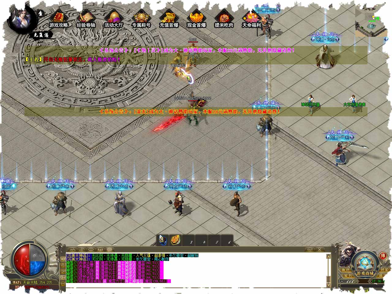 系统公告:本服禁止使用任何WG,发现使用wg者,不管是否花钱,立即封号! 系统公告:请玩家保护好自己的帐号和密码,不要告诉任何人!否则后果自负! 系统公告:如游戏中遇到验证宝宝时,请用验证技能打掉,否则将被认定为脱机! 游戏介绍:第一大陆 切割满13元+称号满11块开启沙城捐献狂暴下捐献地图 打点基础装备(主要打元宝转生 10转可以下二大陆) 游戏介绍:进入二大陆 土城左边 东方神州 打开大地图(按M键打开) 可以看到很多地图 找能进的地图打 随便进可以 打怪 必爆专属装备 刷元宝的好地方。 游戏介绍:进入二大陆以后 (渡劫到6级 ) 打点专属武器 回城再进二大陆 打开BOSS查询NPC 查看BOSS刷新没有 (BOSS查询所有BOSS全部清一遍. 游戏攻略:本服中的大部分怪物皆可爆出自身专属的装备,属性非常强大! 游戏攻略:提升等级除了打怪跟泡点外,还可以使用经验卷轴在左上方按钮处升级! 游戏攻略:本服为无限刀速度,捐献沙城后还可获得极限刀速加长! 游戏攻略:越级打怪时,如果感觉到有心无力的话,可以去升级下你的打野刀! 游戏攻略:转生等级可以提升你的血量恢复百分比! 游戏攻略:魔法盾,护体神盾等高级技能,可在奥秘大师处用奥秘书页来进行抽奖! 游戏攻略:在越级打怪时,人物的吸血极为重要,吸血可通过装备鉴定,或者会员赞助,武器获得! 游戏攻略:新区60分钟开放的火鸡活动,请务必参加,真火鸡可直接爆出一份回馈大礼包! 版本地址