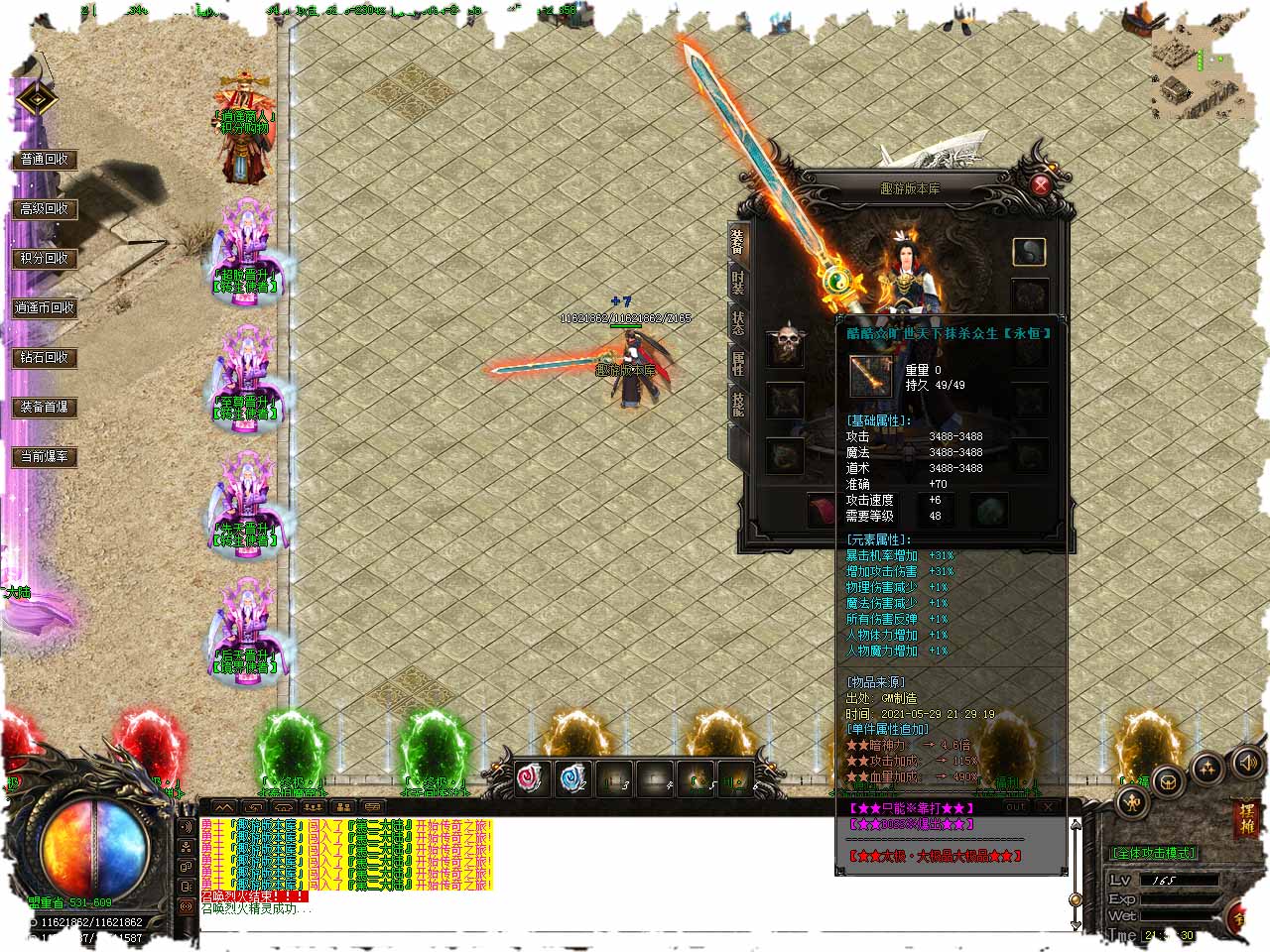 变身·祖玛战甲→打怪爆率→50% 变身·蝎蛇战甲→打怪爆率→100%。 变身·猩猩战甲→打怪爆率→150% 变身·沃玛战甲→打怪爆率→200%。 变身·黄泉战甲→打怪爆率→250% 变身·麒麟战甲→打怪爆率→300%。 开启:酷酷夏日回馈礼盒可随机获得6大战甲中的其中一件。 购买:酷酷夏日回馈兽甲礼盒,需要30000钻石。 ★上古禁地★进入条件:301级+元宝1000万+积分1000个+逍遥币1000个。 飞升四重需要:元宝 6亿+积分12万+逍遥币10万+逍遥逆天石*35。 逆天四重奖励:HP + 13000000 攻击 + 2888 赠送飞升护体lv.4 (技能伤害减少20%)。 齐七件酷酷夏日变身兽甲可合成[万兽之王]→打怪爆率400%,加血,加攻,附带:本服唯一防冰冻属性。合成一:7件不同变身兽甲+兽甲融合石20个。 充500赠送十步一打,8X8范围内,强制麻痹2秒等级比自己低的玩家。 充999赠送挂亡之眼。挂亡之眼附带紫毒伤害 中毒者被攻击将承受1.2倍伤害。 为维护本游戏持续发展和开资,仅出售这2本技能,本服承诺这2本技能怪物均有几率爆出。 版本地址