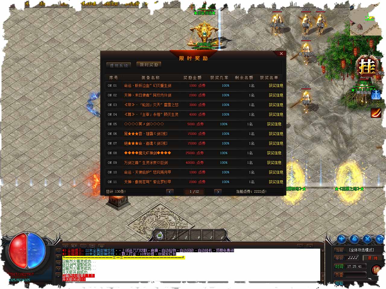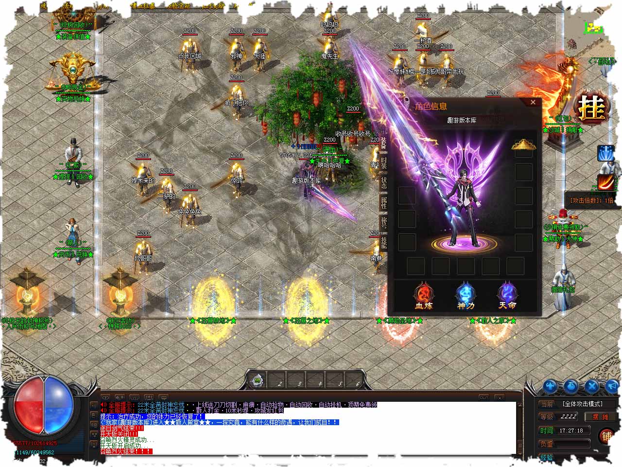 游戏介绍:爆率介绍:本服谁有装备全部靠打.爆率非常高.小怪也爆全部装备.打金回收高。 小怪刷新:小怪每10分 20分 30分刷新.所有怪物都爆终极套。 BOSS刷新:蓝色.红色.绿色怪物刷新时间为:60分钟和120分钟!! 进入说明:进入要求:530级等级。 友情提示:碰到游戏点怪物一定优先击打.游戏点怪物颜色为黑色.随即爆5毛游戏点-100元游戏点. 本服特色:独特无敌挂机.麻麻再也不用担心被人打了..本地图可以无敌挂机.... 九星连珠之,至阴之气涌现,大地被黑暗笼罩,万千魔神纯纯欲动。 玛法大陆的勇士,偶得帝王觉醒神石,聚天地元气为己用,从此逆天! 改命,横推万敌,雄霸天下。。。 激活条件:帝王觉醒石*10+10000点劵。 雄霸天下:随机给与1.02倍攻击血量-1.30倍攻击血量(也有几率消失)。满属性(1.30倍攻击血量)-1.30倍攻击血量。 版本地址