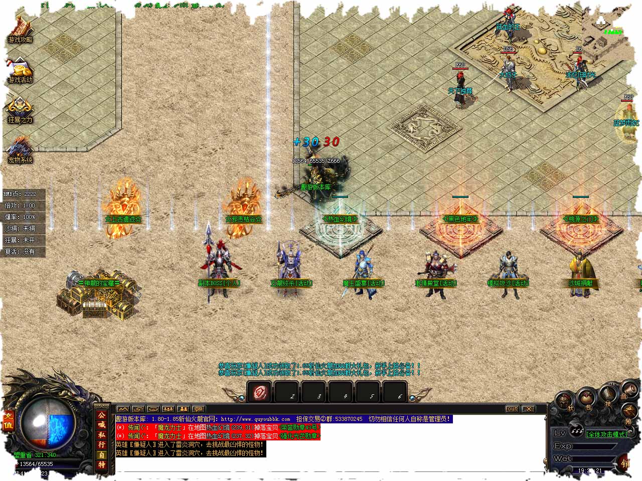 【游戏简介】:2021独家巨制,全新版本,匠心之作,巨资广告! 【版本介绍】:一直被模仿,从未被超越,版本开创者,请支持正版火龙!!! 【元宝充值】:1:1RMB点22全满,无任何暗坑,任何隐藏!! 【开区时间】:每天稳定四个新区。长久开放。公平公正。不多开不少开。 【关于拿沙】:新区开区第二天合区,晚上集体拿沙,拿沙奖励非常丰厚!! 【爆率介绍】:所有装备怪物全部爆出,绝无保留!物品均有来源完全透明!! 【关于封挂】:重金定制GK封挂网关,杜绝一切外挂,打造绿色游戏!! 【经营理念】:绿色游戏,公平公正,守护传奇最后一片净土,做最后的散人大服! 【版本介绍】:本服全满为70+2+2RMB(沙捐20米+合体称号20米+女神的祝福30米高倍攻+狂暴2米+2米超级回城石)。 【版本介绍】:首先可以先去魔龙血域打点基础装备和元宝,再去更高级的地图打。 【版本介绍】:(魔龙血域→桃园之门→黑色地牢→热血幻境这些地图小怪主要爆赤月到王者,BOSS爆王者→灵器装备) 爆率中。 【版本介绍】:(邪恶枯谷→上古遗迹→炼狱古宫→炼狱神殿→神魔战场这些地图小怪主要爆强化到白帝,BOSS爆到斩仙装备)爆率高。 【版本介绍】:(极限之地→冰封雪域→魔影邪庙→失落魔殿→混沌神殿这些地图小怪全部都爆,BOSS爆次终极,终极)爆率超级高★★★★★。 【版本介绍】:有沙捐的可以先打点基础装备再去沙捐地图打,本服的沙捐图跟高级地图爆率适当 【版本介绍】:记住本服以金币和元宝货币为主,BOSS基本必爆100金币。 【版本介绍】:个人副本,五龍绞PK,魔王盛宴活动一定不要错过,模拟攻沙金币最快,一定不要忘记参加了。 版本地址