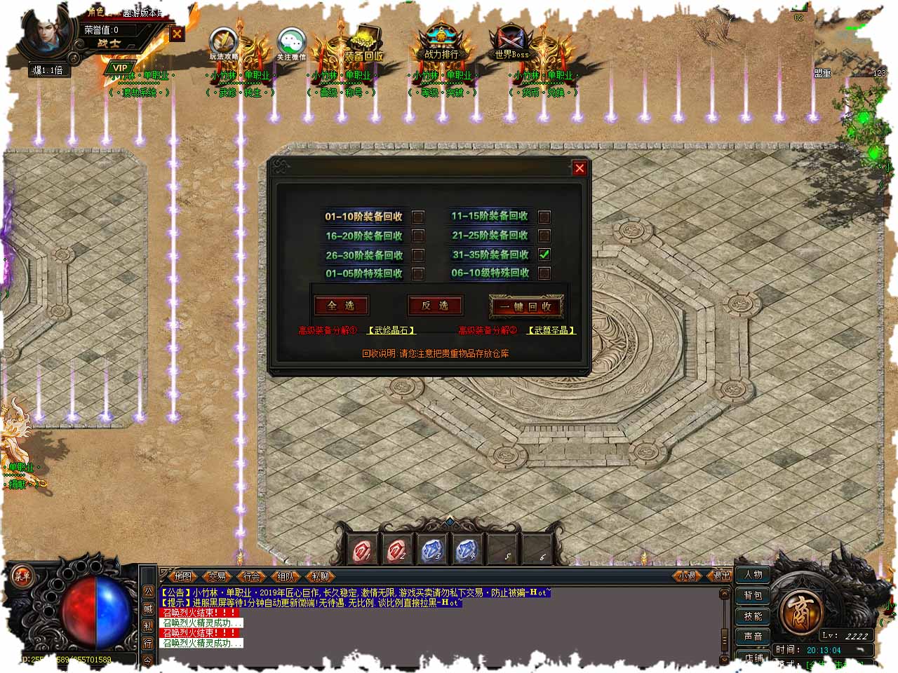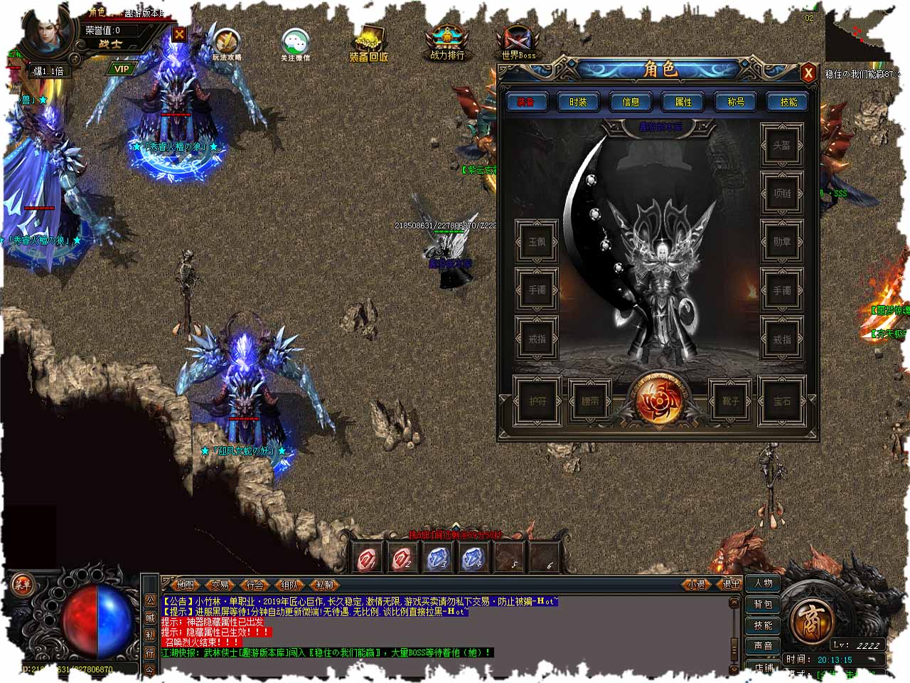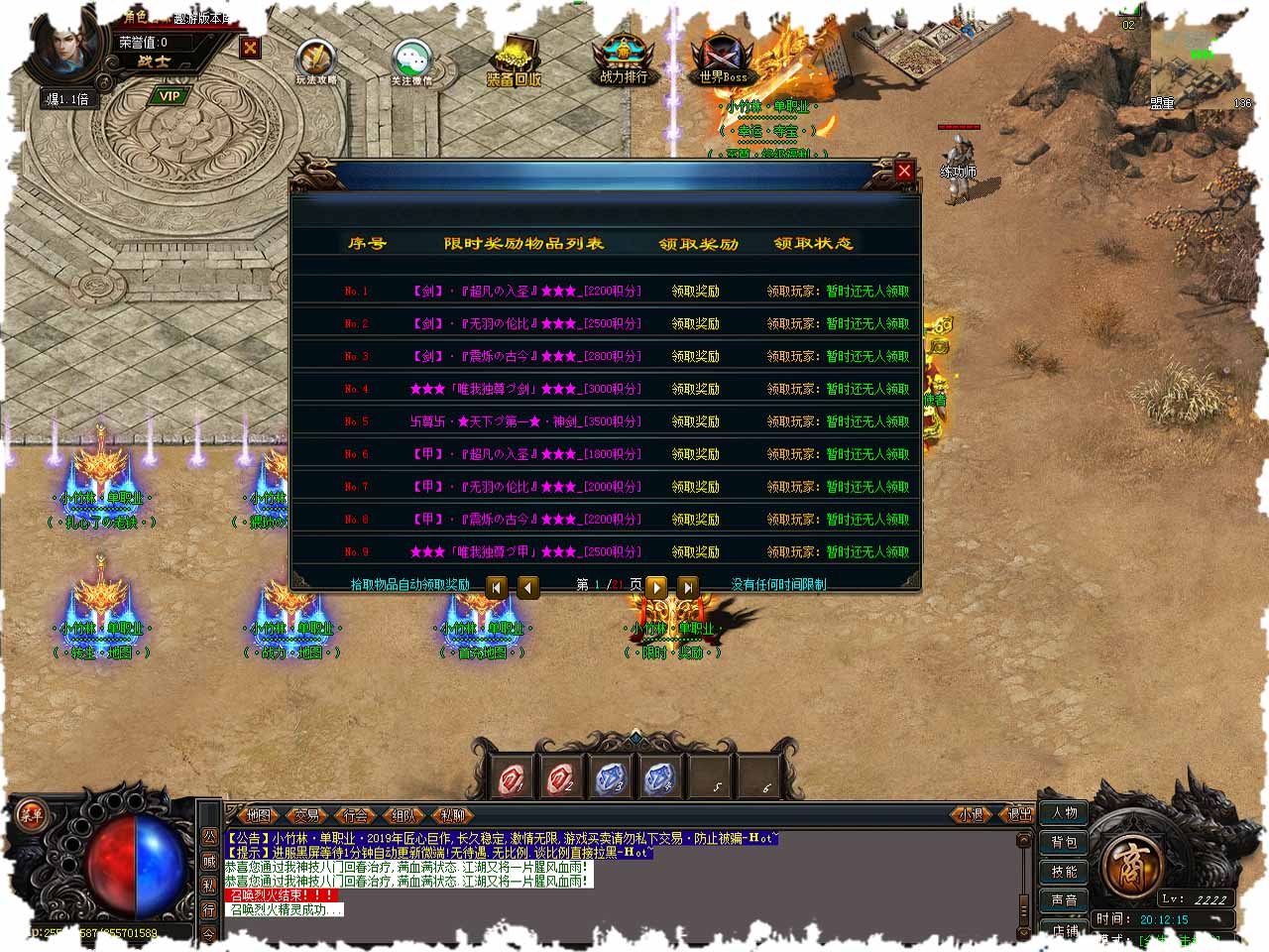游戏介绍: 游戏中可冲游戏点、摆摊买卖、获得的游戏点 等级介绍:1-600土城泡点.加入会员可以任何地图升级,600-900 打怪爆等级丹吃,900-1000打怪爆等级丹吃,切记 至尊等级丹 是稀有的 要珍惜. 怪物介绍: 白色怪、 橙色怪、 橙色怪、 绿色怪、 新区爆率怪、打掉加成爆率、所有怪吃麻痹 前期就可以直接上打怪、告别被怪物打掉的游戏 怪物刷新:普通怪物刷新时间为30分钟,橙色BOSS刷新时间为60分钟,白色BOSS刷新时间60分钟,所有地图均有不等数量的BOSS 装备介绍:本服共50套装备、新增51-52套剑甲.另加6套倍攻首饰、时装6套、生肖3套、每样特殊各15套、特殊0级是终极、爆率全开、新手怪都爆终极。 新人介绍: 首先设置二级密码,在土 98 82 加群领序列号为:2021888,可领取施毒术 隐身面具 1000万刀刀秒血割 麻痹护符 开天 逐日等。 装备区分:装备区分:本服装备层次,绿色-橙色--蓝色-白色,终极装备爆出,华丽光柱闪爆地图. 称号介绍:共分14级,可以通过游戏币晋升,或者打怪直接爆出成品卷称号可以直接使用. 攻城奖励: 88红包 -- 188红包 根据人数决定最低88,登录器公示,沙巴克老大领取分配。 散人、小资、土豪如何发展? 礼包中的麻痹护符无限麻痹怪物 、1000万刀刀秒血割对所有怪物都触发切割属性 本服所有地图都可以进入,散人可以打怪爆神秘地图卷进入你进不去的地图,只要花时间你就能成功! 本服满转封顶30转,转生获得相应的转生倍数,30转获得3.1倍叠攻击倍数。 本服装备材料比较值钱,各种技能书、各种材料,各种特殊装备,都是强者的必须品,打造完全免费。 本服有神秘地图卷爆出,可以随机下所有地图。能下什么地图就看你的大白脸了,也算是一种散人福利 可充值适当游戏点去夺宝 本服夺宝绝对不坑 只要你脸好久能抽到终极奖品。不会像别的服必须要抽到次数才出 小资玩家 可实际充值300领取土城300礼包 高级称号和切割 商铺买转生材料直接20转 下2大陆 下充值地图 积分地图 各种打BOSS。 人民币玩家 可实际充值500领取土城满回馈礼包 并且可下所有充值地图 土豪玩家 可实际充值800领取武林至尊 有专属地图 爆率可观 。而且有神秘功能 具体上服查看 很新颖的功能 有能力的可以充值 游戏点去抽奖 所有物品可以在游戏用游戏点自由交易 注意 所有玩家 包括土豪玩家 积分和元宝一定要捡取,因为后期元宝要用来洗元素,积分下15000 20000积分地图。还有很多用处。游戏自行体验在地图遇到 『阎王殿』的怪一定不要错过 唯一爆出超级神装的怪。可以一步登天,千万不要错过。 版本地址