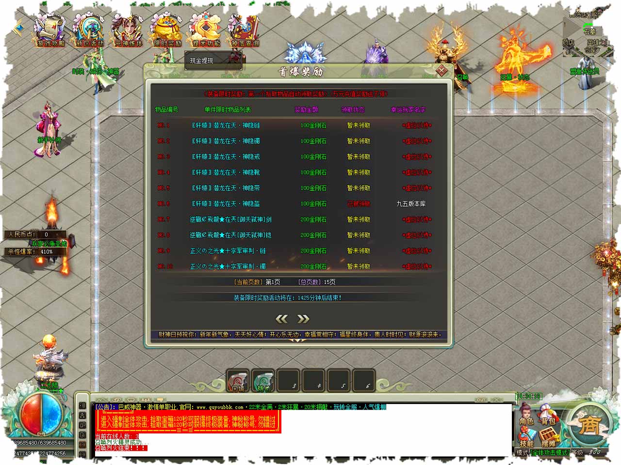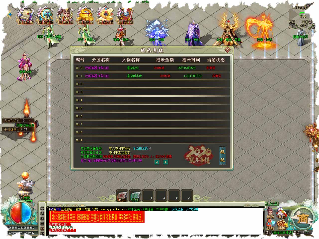 2020年新版单职业-巴威·散人逆袭之作,装备靠打√爆率全开√掉落一切。 勇士,这里可以把你鉴定的高星装备转移到新的装备上,转移条件1:需要转移的装备必须大于四星以上,转移条件2:强化越高 越能抗怪··群怪利器。 游戏介绍:实充300以上可以自助转区.(50%真实充值到任意新区),积分专属活动,200积分领取一次,(实充200),本服支持自助转区 自助一键卖号(帐号保值NPC,帐号交易市场处了解)。 转区介绍:首先,完成-输入转区信息,转区完成后此角色删除,然后,创建输入帐号的任意角色进入任意分区再此NPC可领取转区充值。 版本介绍:打造单职业传奇新概念,开区6小时内等级达到605玩家奖励,51级-52级武器,随机抽取一把。 攻城介绍:开区第2天晚上20点首次拿沙,第2天17点左右合区。:参与沙巴克人数以进入皇宫人数为准,发现使用小号充数奖励一律不发! 其它介绍:为回馈广大玩家,特推出测试区打到的元宝.金刚石正式区返还系统,可返还从游戏中回收获得的元宝和金刚石,返还比例为测试区打元宝和金刚石总数的50%。 版本地址