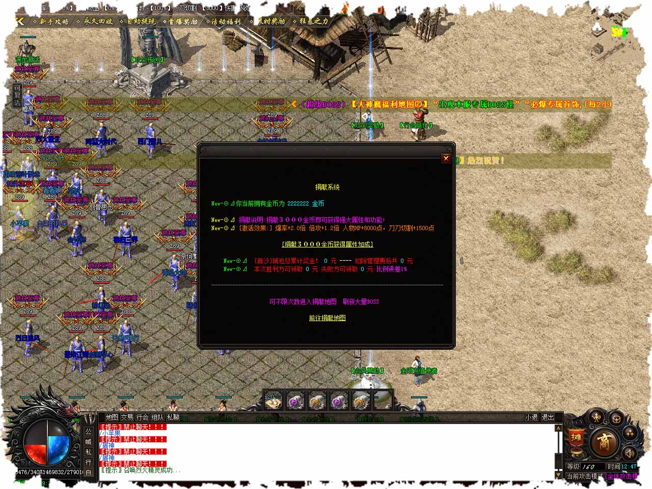 玩法介绍:当人物等级不低于[137级].需“雷劫上古石+100万元宝”即可渡“雷劫”“雷劫上古石”只能靠BOSS爆出。能否接受雷劫洗礼,并且成功躲避雷劫,完全看运气,修圣渡劫,只为游戏乐趣,绝对好玩,有趣,各种属性,各种超越,游戏体验哦。 版本介绍:最后一个“十阶”雷劫,难度适当增加,可选择“金刚护体避雷法”系统。 版本介绍:每次“金刚护体避雷法”可降低(2/3)的雷劫威力。 版本介绍:每次“金刚护体避雷法”作用时间为5秒。 版本介绍:每次“金刚护体避雷法”收取:“20000”金币。 版本介绍:建议适当使用“金刚护体避雷法”,渡劫可以复活,盲目使用就是浪费哦。 地图介绍:双倍刷新必爆地图-必爆终极装备,每2小时刷新终极必爆怪,随即必爆终极一件。 爆率介绍:进入此地图者,可以免费领取一套终极生肖(属性无敌)。 属性介绍:160级,免费激活魔法盾、护体神盾、十步一PK、冰霜群雨。 属性介绍:160级,免费激活擒龙手、挂亡之眼、六大超级牛的技能。 版本说明:小神魔9级-10级,附加10000金币费用,4个9级触发1.2倍攻魔道】【洗髓丹-血龙魄珠-恶魔令牌=统称三宝,背包按钮“在线回收”装备分解快速获得。 版本地址