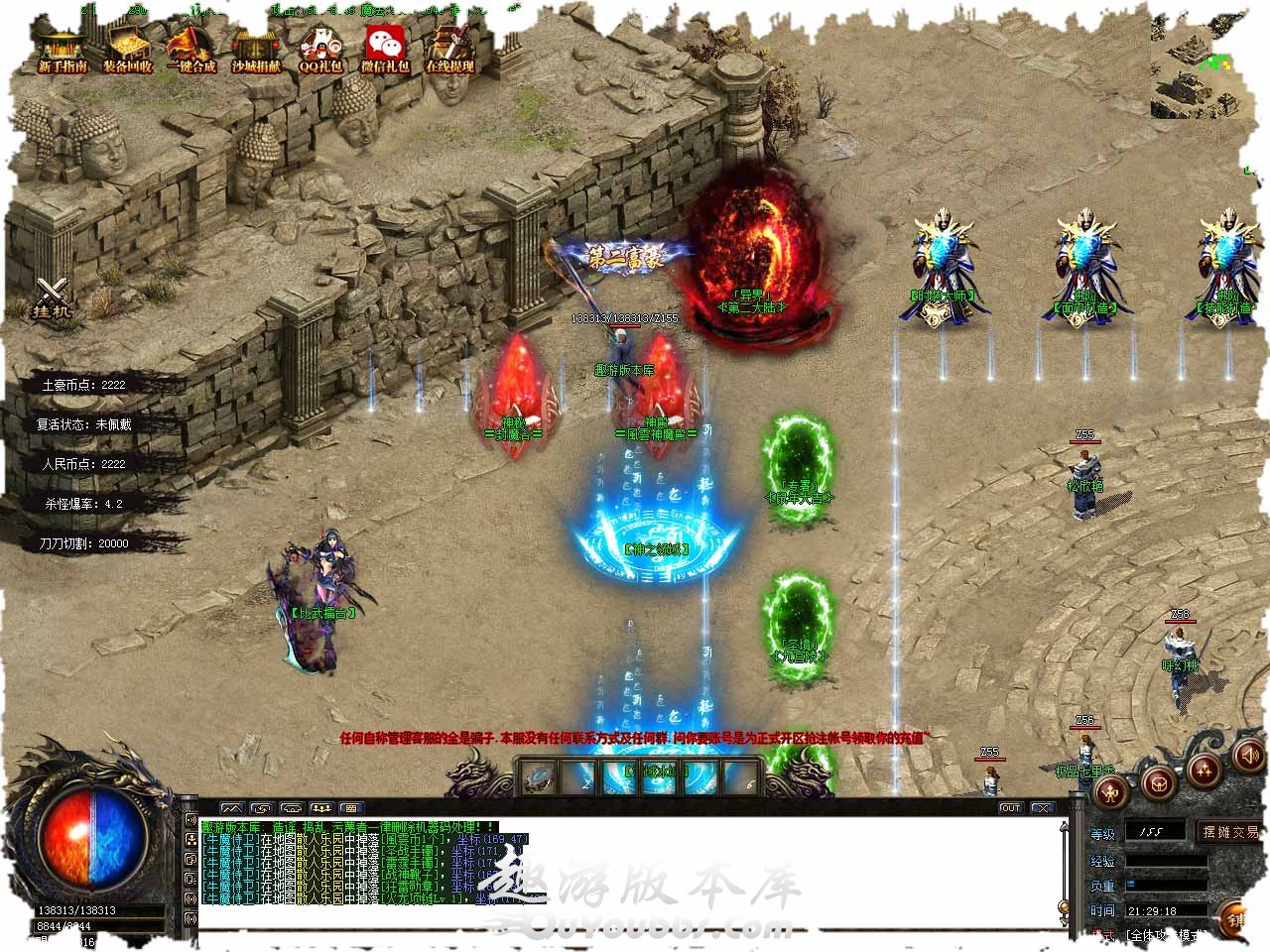 赞助地图:赞助地图进入条件,每日冲18的玩家可进入,本地图,散人,打金,优选地图。本地图,为所有地图爆率的2倍,每2时刷新3只大BOSS,風雲六魔。 终极装备出处地图爆率,每2小时刷新最终BOSS!1小时刷上古神兽和神王!30分各种小怪。 勋章介绍:1.1倍攻勋章只有打怪爆出,合成風雲倍攻章1.5需求:1.0倍攻章1个 + 8888風雲币 + 成功几率90%,失败不化装备,風雲币扣除! 版本介绍:散人BOSS为本服福利怪.好打爆率高.散人请优先打散人BOSS.发展很快。 终极时装:终极时装打造需要:浮生若梦时装+58888个風雲币+游戏点1888个,时装触发元素+12 触发:生命值提升120% 攻魔道提升100% [防全毒]。 其它介绍:本服各地图会爆出战鼓和碧玉1.1,2个可以合成一个,碧玉装备附带攻击、加HP强化属性,等级越高属性越高! 版本地址