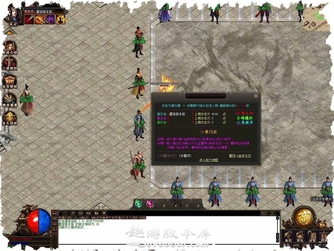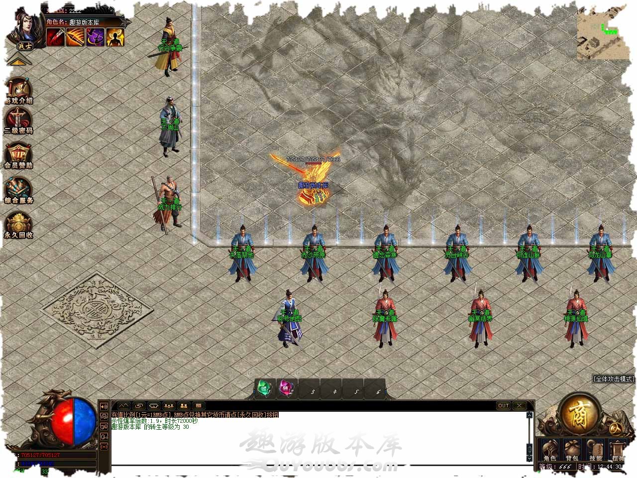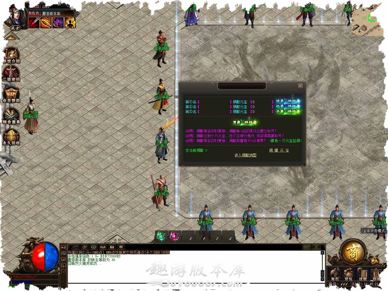 称吃地图:怪物分布是纯BOSS模式,普通BOSS:30分钟,福利BOSS:60分钟,终极BOSS:120分钟,爆率指数:地图爆率提升10%-30%!,进入需要拥有对应称号以上。 凤凰之力:传说凤凰涅槃之后,将力量封印于天地灵物身上,击打鬼级以上怪物会掉落凤凰之羽,凤凰之羽用于激活凤凰之力,凤凰之力一共可激活100次。每激活一层,人物提升攻击力:50-50,HP:500-500,当凤凰之力达到100次时,激活人物50%几率原地复活属性,让你像凤凰一样的存在,每次激活需要10个凤凰之羽,激活成功率50%! 行会争霸:每6小时开启1次,持续10分钟,最终胜出行会将可进【专属地图】!活动开始后刷新【守护石】,击打之后暂时可进地图,并且再次刷新【守护石】,如果【守护石】被其他行会打掉,【地图将随之改变! 狂暴介绍:通狂暴开启条件:每次开启需要30游戏点。普通狂暴属性奖励:1.2倍攻击+20%攻击属性+1.2倍爆率+刀刀切割5000点。 鉴定介绍:鉴定共分为〖B级、A级、S级、传奇〗四个级别!每次鉴定需要[50000]元宝,BUFF勋章最高可存在三种BUFF,20余种神秘Buff可选! 版本地址