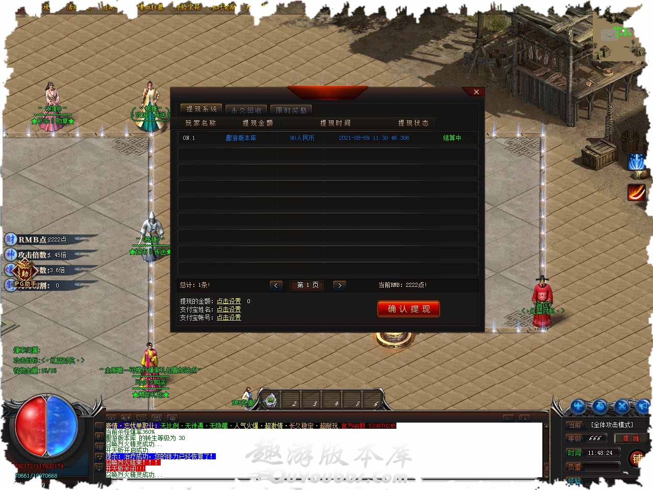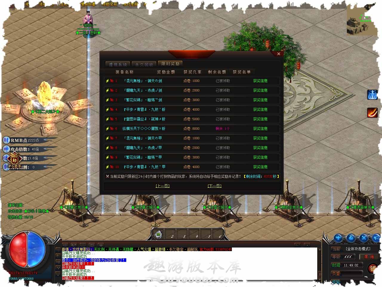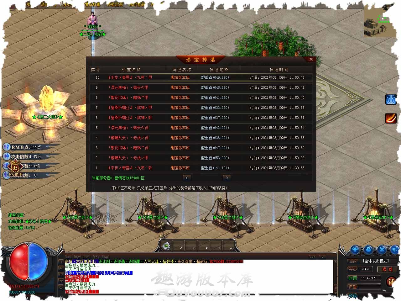 版本介绍:先升级先起飞,新区前6名升到450级奖励:打怪爆率,合区后取消额外爆率。 地图介绍:幸运魔塔地图每12小时刷新一只必爆追梦怪,最低爆出38-45阶段回收件以上【必抢怪】,首站区此地图怪物爆率已经加强,30%几率掉终极首饰,15%几率掉落终极剑甲,合区后关闭本地图,请大家抓住机会哟!! 版本介绍:开启沙捐“免费领取”20游戏点,可重复购买(每购买一次可增加100%爆率再送2w点劵),此消费50%用于沙城捐献(全部用于攻城奖励)。 版本介绍:神魔大战几千年,损坏了很多神器,掉落在各大领域,来寻宝的勇士络绎不绝,最多也只能获得一些残品神器,即使残品威力也是非常惊人!吾已在此等候数个世纪之久,始终没能看到一把完整的神器。風★★★雲·雄霸ミ剑熔炼条件①:風★★★雲·雄霸ミ剑[残]×2,熔炼条件②:点卷*100000,熔炼条件③:帝王觉醒石×50。 版本地址