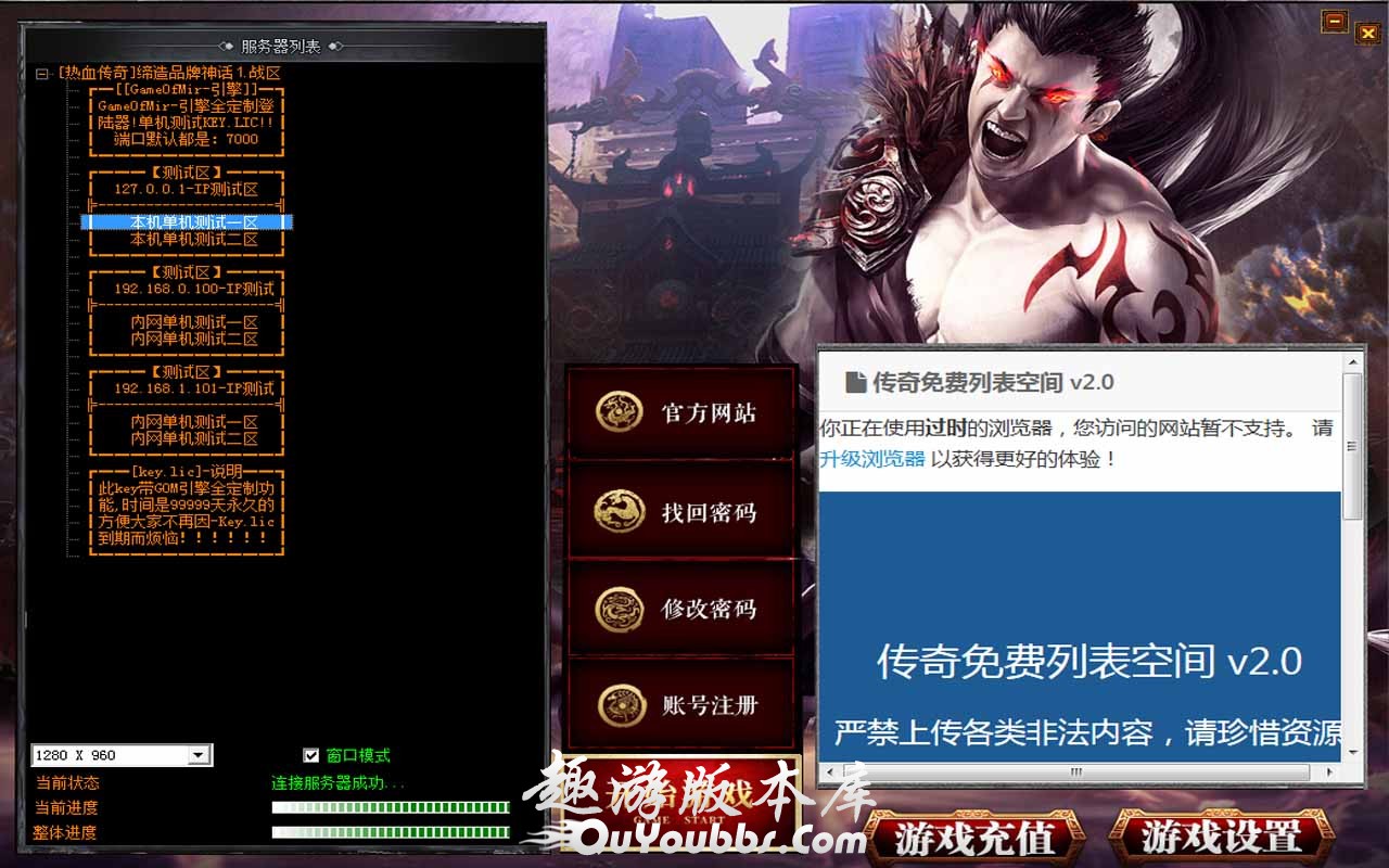【游戏简介】全新独家版本,全新独家玩法,匠心之作! 【元宝比例】元宝靠打,散人玩家的天堂,一切为了人气! 【攻沙合区】开区第三天拿沙。晚上集体开启沙巴克之战! 【爆率介绍】本服所有装备怪物爆出,绝无保留,一切简单化,装备带出处! 【关于封挂】高端定制封挂插件,禁止空白名! 版本地址