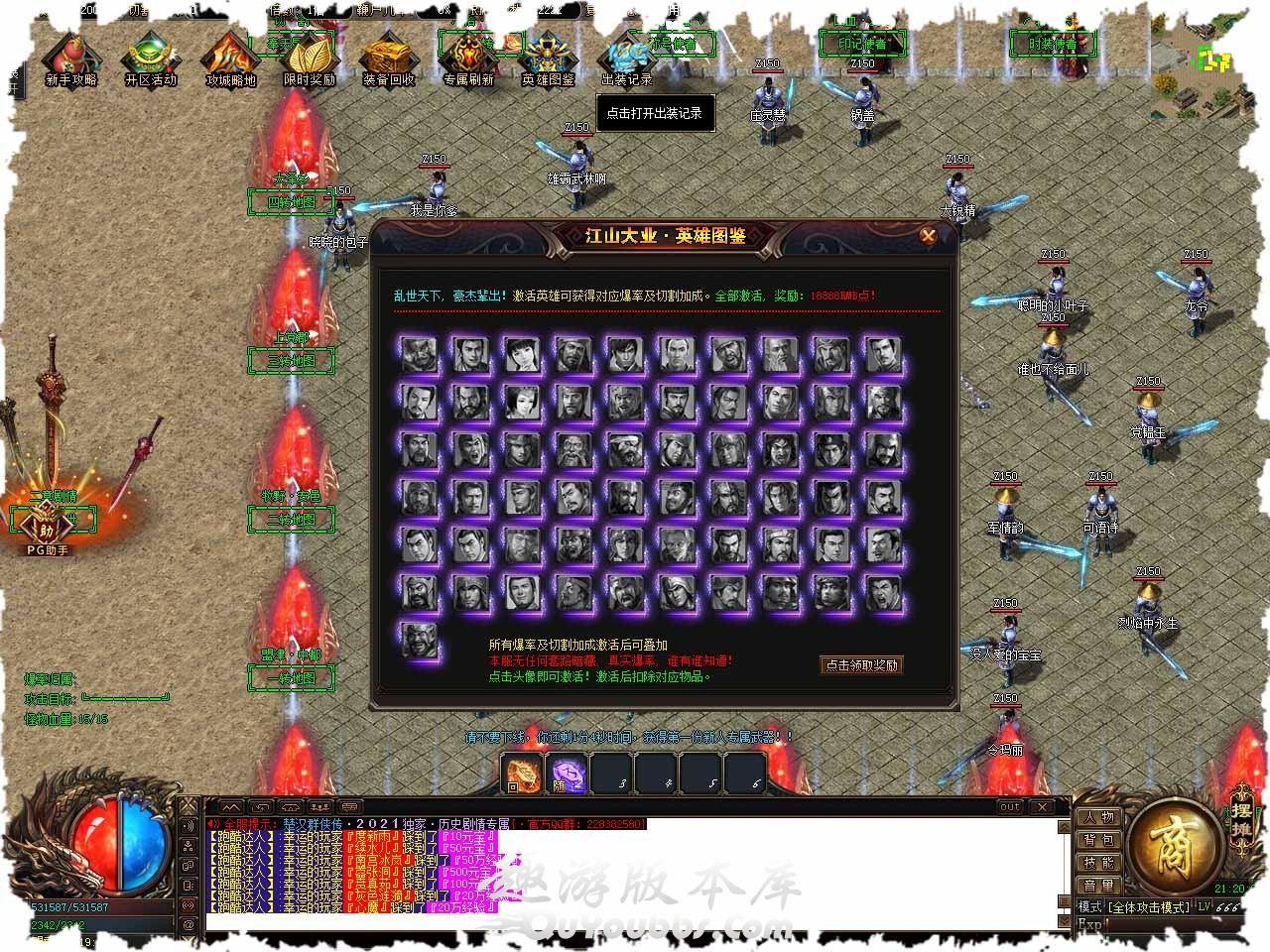 本服沙奖励丰富,保证玩家每天攻沙都有奖励获得,[捐献获得永久属性] 切割,生命+3000、打怪爆率+50%、一档赞助会员、8*8自动拾取 本服唯一赞助,无隐藏,特色公益服。 赞助一档:沙捐后免费领取,8项超级福利,你值得拥有! 赞助特权: 1、1.5倍攻击、回收 2、人物直升三转 3、人物爆率增加50% 4、随身经验每秒+600w 5、人物HP量+5000 6、人物切割+5000 7、30万启动元宝 8、自动捡取。 [友情提示]参与沙城捐献后免费领取 赞助二档:580汉诺点开通,12项超级福利,你值得拥有! 赞助特权: 1、100万启动元宝 2、赠送回HP、复活印记,前期无压力 3、赠送切割星轮[三才]4、人物爆率增加100%。 5、人物HP量+8000 6、人物切割+8000 7、人物直升五转 8、随身经验每秒+800W。 9、自动回收 10、[时装]千古一帝(传送+斩打功能) 11、自动挂机打怪,解放双手[友情提示]需先领取一档赞助才可开启。 版本地址