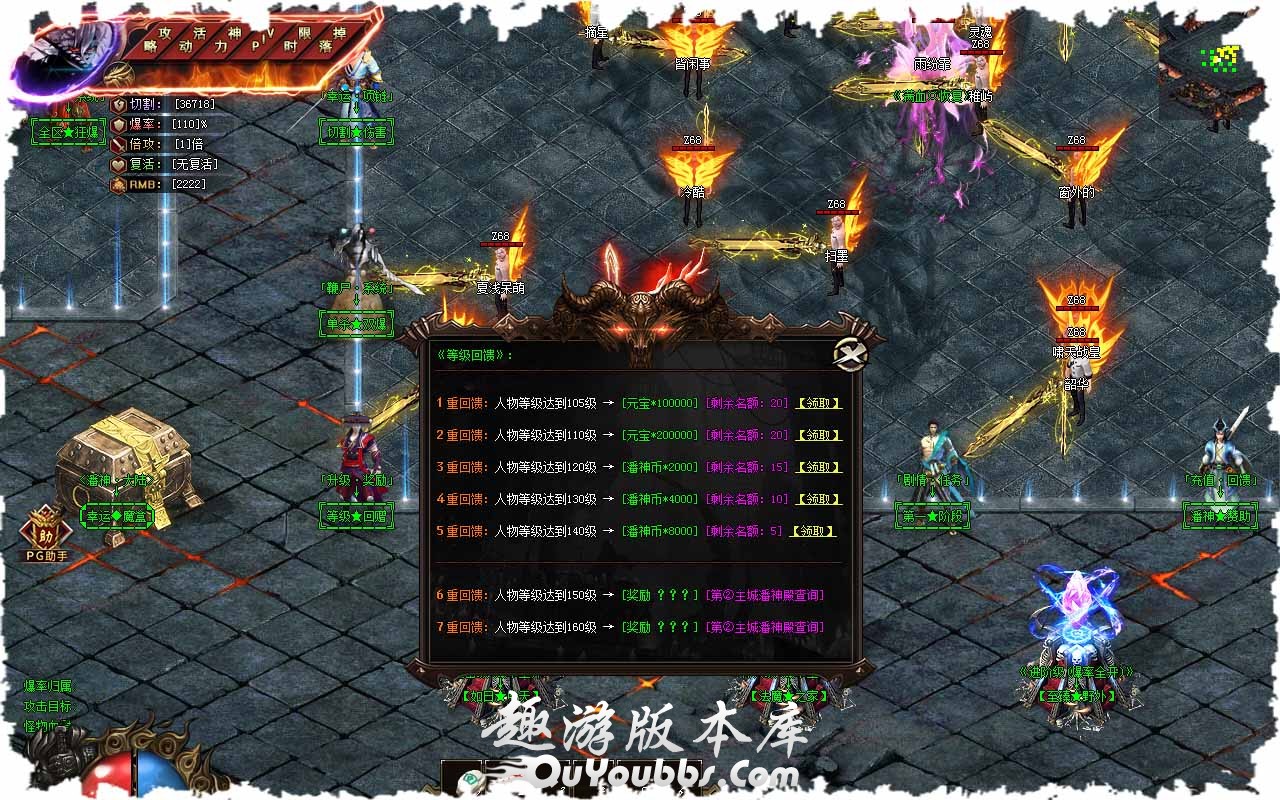 【测试奖励】测试区所有[回收装备]的元宝,自动记录到测试奖励!条件说明:比如测试区回收元宝数量1000,正式开区后可领取相同元宝数量!本功能自动记录,纯福利! 【版本介绍】本服只允许游戏点兑换,潘神币兑换可在[游戏兑换NPC处进行〕,激励兑换比例:1比120,永久兑换比例:1比100,正式开区三小时内兑换。 【活动介绍】玄空之门,封印多年,开启大门,爆率高,开启即刷新[独家专属Boss]*100,每日02.00-04.00-06.00-08.00-10.00-12.00,活动要求,开启[潘神之力]潘神币*500,[地图规则]:总层数[1]层,每秒扣除100元宝。 【等级奖励】人物105级以上可在NPC处领取升级奖励,1、人物等级达到105级 → <[元宝*100000],2、人物等级达到110级 → <[元宝*200000]。 【合区介绍】新区开区后第3天17.00合区,合区前请下架个人商铺,次攻城奖励:沙巴克城主可领取 50积分+3000游戏点。 版本地址