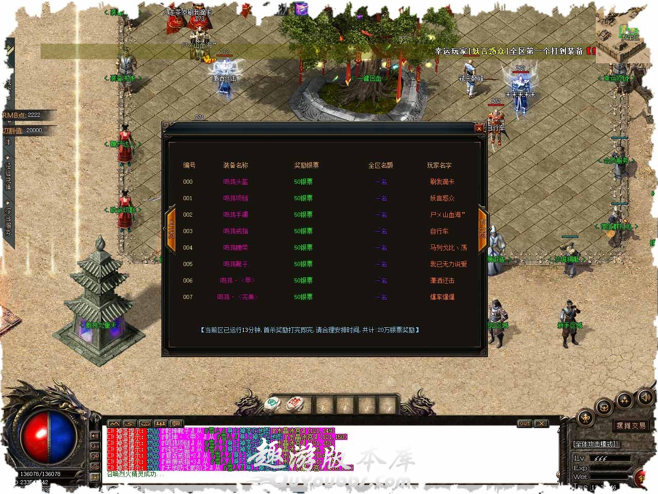 本服为特色复古沉默神器,游戏所有设定均以长期服发展为主,每个单区每天送奖励!! 测试区打到首爆,首打,回收装备等银票,正式开区可领取100%,无需手动记录,正式开区直接到NPC领取即可!(安全区右下) 特别注意: 经验箱子,各种材料,散人玩家可以摆摊出售!~~ 好东西 1-3转材料很好爆,4转以上爆率稍低, 沙城捐献地图,神火荣耀地图,会员地图,潜龙地图,首富地图,清风谷,傲视九重天4-8转材料非常好爆,特别是沙城捐献地图,最低爆4转材料·········· 沙巴克捐献的 重装地图 傲视地图 会员寻宝 荣耀地图。这些先打。·然后再挨个的。到其他地图找BOSS·· 切割法宝天地盾,请在安全区下方升级, QQ群礼包直接赠送1级,高级盾牌靠爆出,切割的等级越高切割越厉害! (此法宝非常重要,只要有银票建议首先升级) 切割等级可免费转移,比如你当前是1级盾牌切割升级到5级,当你打到2级或者3级盾牌的时候可以通过NPC把 1级盾牌上面的切割直接转移到3级鼓上面!~切割几率是根据切割等级决定! 注意:为了方便玩家,在土城右边增加了 <宠物功能> 宝宝非常牛B,宝宝群体切割,毒等功能!~具体看个人需求, 各种稀有材料,普通材料均可在安全区内摆摊出,本服长久开放,公平公正公开,还原绿色传奇,给玩家一个纯净的游戏环境!!! 版本地址