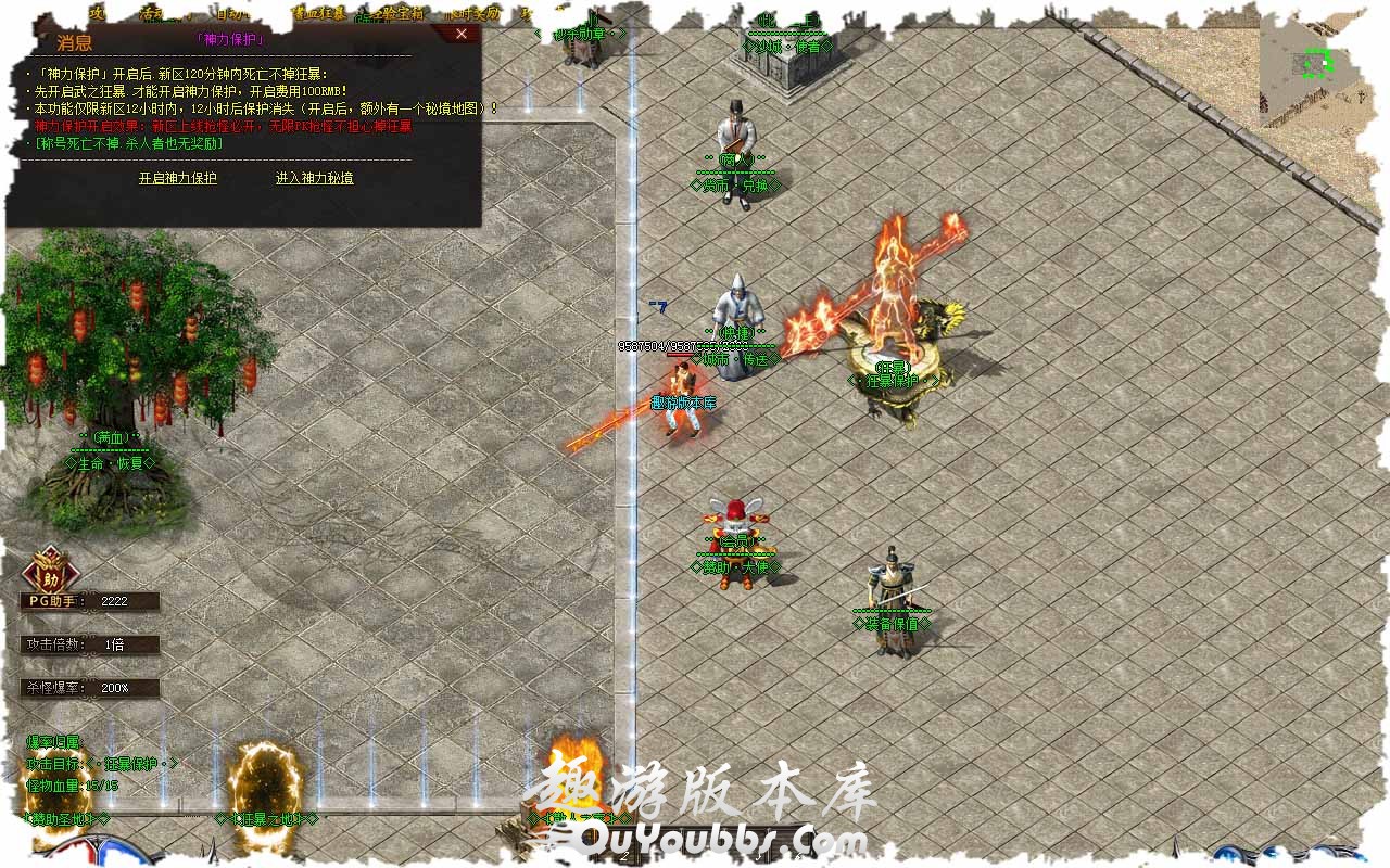 游戏点点卷一定金额达到对应等级后,可开启幸运大爆! 游戏点数量达到500 等级达到250可领取一次。 游戏点数量达到1000 等级达到300可领取一次。 游戏点数量达到2000 等级达到350可领取一次。 游戏点数量达到3000 等级达到400可领取一次。 游戏点数量达到5000 等级达到450可领取一次。 领取幸运大爆后击打任意怪物,可随机触发回收件,怪物越高级出好东西的几率越高! 第二天下午14:00点合区,晚上8点开始攻城,沙捐说明:前三名有相应的称号属性,第一名属性:1.3倍攻+HP+88万+全元素+10%+爆率增加3倍,第二名属性:1.2倍攻+HP+38万+全元素+5%+爆率增加2倍,第三名属性:1.1倍攻+HP+18万+全元素+3%+爆率增加1倍。 「神力保护」开启后.新区120分钟内挂掉不掉狂暴:先开启武之狂暴.才能开启神力保护!本功能仅限新区12小时内,12小时后保护消失(开启后,额外有一个秘境地图)!神力保护开启效果:新区上线抢怪必开,无限PK抢怪不担心掉狂暴。 散人福利:1、免费自动捡取人物打宝掉落物品2、节省打宝时间提高打进效率,打金必备神器!可直接开启自助捡物功能,开启成功后,请使用命令【~】开启或关闭自动捡物。 版本地址