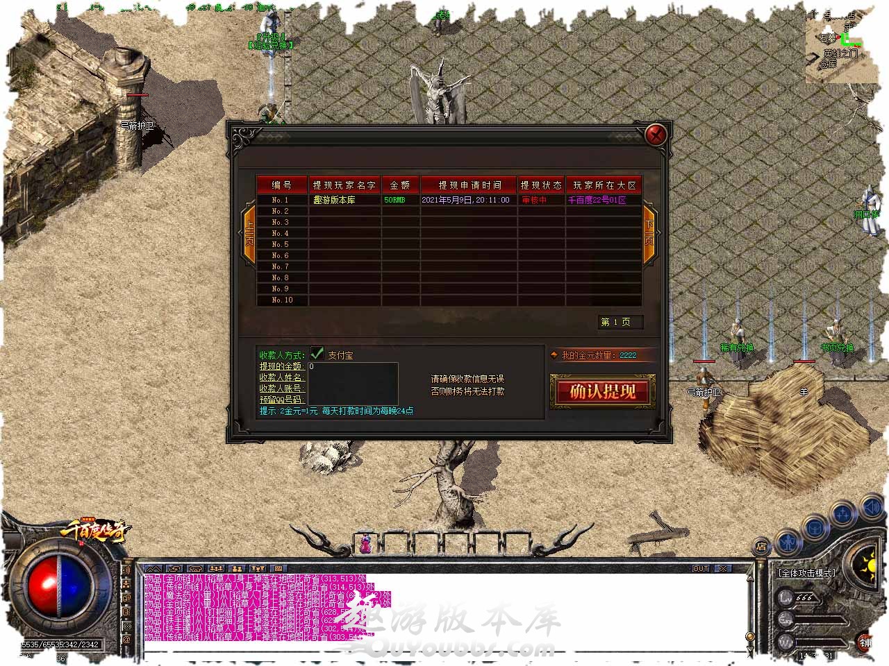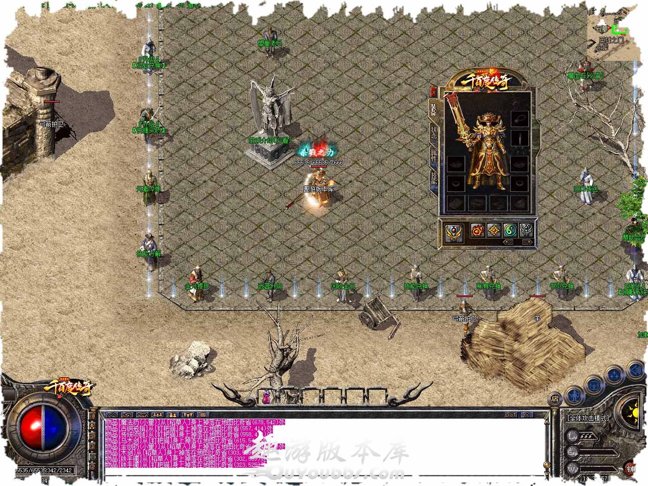 游戏比例1:10,积分1:1 测试额外多送10%。 测试区提前开放,测试区达到36级,38级,40级,42级,正式区分别有对应的奖励。 本服装备全部爆出,绝不私卖装备,无任何隐藏消费,所有小怪.BOOS都有几率爆终极。 沃玛-祖玛-赤月-赤月+1-赤月+2-赤月+3.极品属性+1 +2 +3比较容易,+4 +5极品稍微有难度。 本服一个月一个新区,正式开区第10天拿沙.首次拿奖励.非常丰厚! 本服散人好混,运9靠打!本服活动多多,独家隐藏地图。所有地图小怪.BOSS出一切! 版本地址