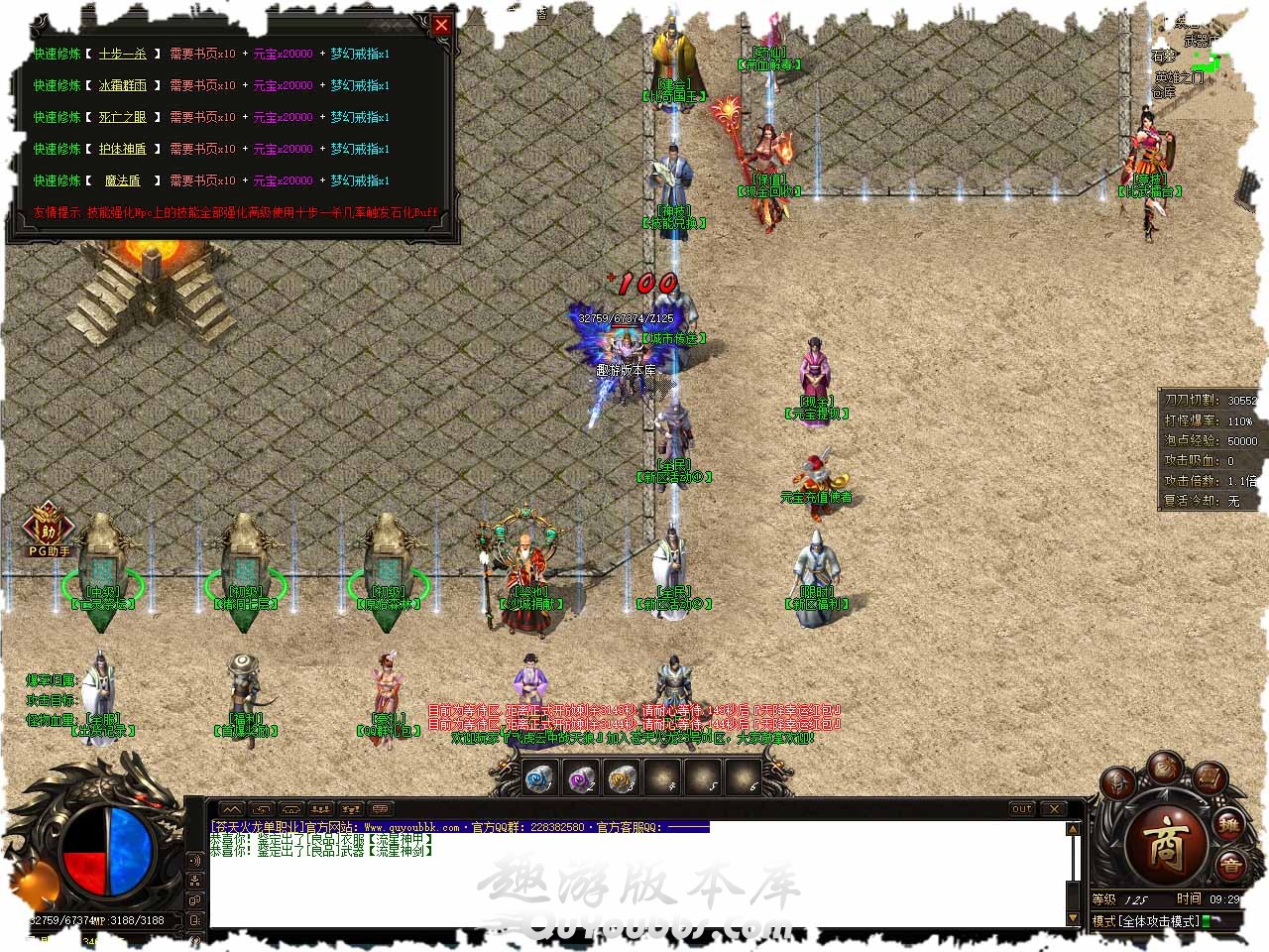 创建行会:创建行会免费创建,沃玛号角x1个,新区开放第2天晚上集体拿沙,无需提交头像,拿沙当晚19点后创建的行会没有拿沙资格,开启行会战前往比奇皇宫,比奇国王。 天魔印记:金之印记:攻击时有几率触发,5秒内拥有破复活属性。 木之印记:复活时有几率触发,无敌状态2秒,无视任何伤害。 水之印记:攻击时有几率触发,使目标的攻击力降低90%。 火之印记:血量低于50%时有几率触发,每秒恢复10%血量。 土之印记:攻击时有几率触发,使目标红名,爆率提高10倍。 魂之印记:烈火击中目标时有几率触发,打掉目标总血量百分比。 风之印记:攻击时有几率触发,使目标5秒内无法使用回城石。 时之印记:逐日击中时有几率触发:,对Hp低于30%的目标一击必打。 友情提示:全套八件5级魔印,永久回收200万元宝,魔印总等级达到18级使用冰霜群雨有几率触发冰冻Buff。 版本地址