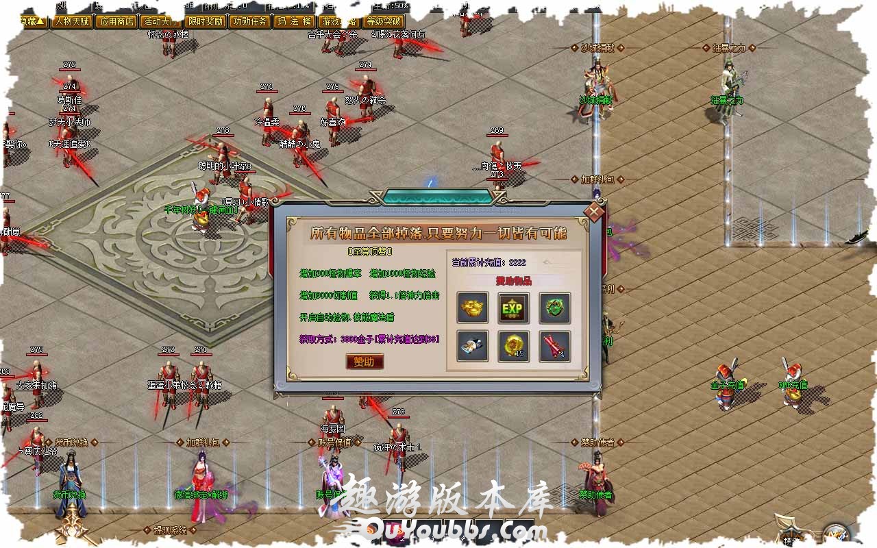 【版本介绍】本服所有当前地图怪物爆出当前地图专属[BOSS]略高一些!不是必爆!长期服!小怪爆终极!!!!神器在手天下我有!!!拥有一件好的神器您将所向披靡! 【版本介绍】真传奇!带你开启双天赋人生!PK!打怪!暴击流!附加伤害流!蓝海流!格挡流!精心制作!敬请体验! 【版本介绍】所有领主BOSS【120分钟刷新一次】,四大名将为90分钟,三大名将120分钟!三大神·将为120分钟! 【游戏说明】四大名将爆专属魂器、专属时装!三大名将爆专属武器,三大神将爆专属真·专属武器!【遇到请不要放过】 【游戏说明】BUFF有几率出至尊大总管,爆出全服所有装备和六大秘境BOSS的项链专属!同时有几率鞭出深渊副本传送门,随机刷新本服所有BOSS【包括轮回和秘境BOSS】,战鼓和天赋可大幅度提升BUFF几率! 【游戏说明】当人物达到92级可以获得21点天赋点,开启神技半月弯刀!打怪速度大大提升! 【游戏说明】当人物达到150级可以获得50点满赋点,开启屠魔之路!打怪打宝打架速度大大提升! 【温罄提示】有些不良GM和玩家出于某种目的诋毁,请大家不要轻信!我们会保证游戏的绝对公平!请各玩家不要将装备随便借给别人,因此原因被骗本服概不负责,并不予以找回! 版本地址