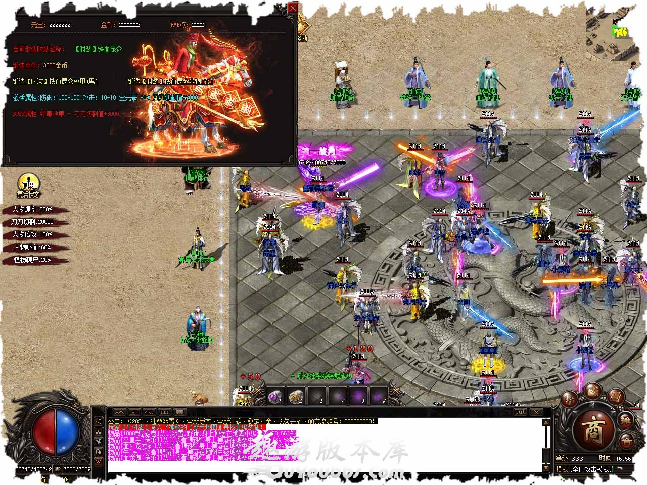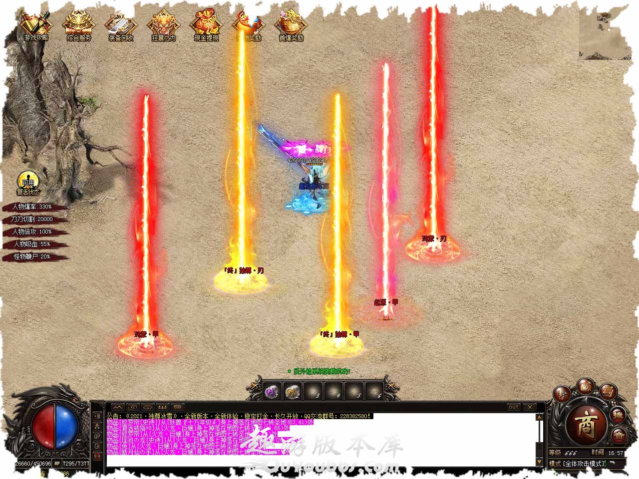 版本介绍:本服终极地图 主爆:终极装备,爆率非常可观,全图刷新终极BOSS系列怪物,主爆:终极装备,爆率非常可观,个别高级地图进入条件,需佩戴“秒怪神器[五级] + 二级时装 + 8转转生 + 三件套”。 版本介绍:本服终极地图,绝无更高级地图,主刷终极BOSS,主爆终极装备。 版本介绍:超级奖励快速秒本服所有终极BOSS,大神魔满15级:触发刀刀切割所有怪物80000的HP量,小神魔满15级:触发刀刀切割所有怪物120000的HP量。 BOSS介绍:主要BOSS:每120分钟刷新1只“生肖魔王”,每180分钟刷新1只“超级生肖魔王”,进入条件:佩戴“全套神级生肖”。 版本介绍:本服所有装备都可爆得,土豪玩家也可选择进阶!进阶需要:「神」君临·刃+35000金币,用心打造经典传奇,让您找回曾经的传奇PK寻宝乐趣。 版本地址