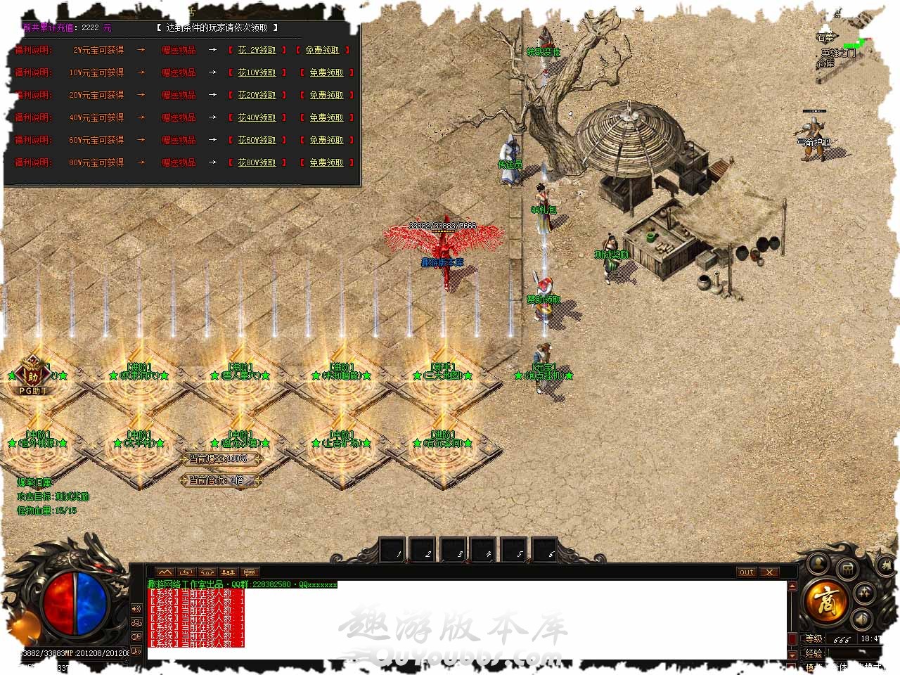 版本介绍:新增超级特殊合成系统,可在游戏中NPC处能合成您需要物品!合成时请把合成物品放在背包里! 等级系统:版本可突破到200级,突破等级需要莫大的勇气和毅力还需极品的仙丹来破界重塑神体,需要等级突破丹,每提升一级突破丹需求增加50颗,突破成功率:百分百成功,突破丹获得:各大BOSS均出。 版本介绍:四格合成系统,四格合成兲芐系列对应四格+20W+对应材料*200,在我这合成所有四格合成价格和碎片都不一样,聚义时装合成需要苍穹时装+588个时装碎片+20W元宝。 元宝挂机:版本中有元宝挂机地图),每秒获得1000W经验,不过每秒收费150元宝,最高150级。 版本介绍:新增斗笠合成系统,初始可使用斗笠碎片+元宝合成初级斗笠,往上使用一阶斗笠+元宝等继续升级。 版本介绍:新增狂暴之力,增加属性:攻击倍数+1.2倍,怪物爆率+50%,狂暴神力一旦开启,除非挂掉,否则一直生效下线保存,狂暴神力击打携带狂暴神力,玩家可获得1W元宝,特别提示:拿沙期间会掉落。 版本地址