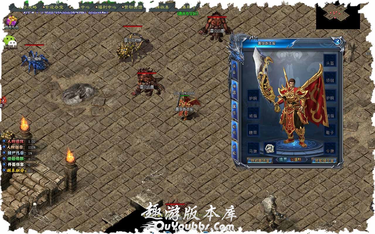 [版本概述]-轻变+暗黑+沉默+火龙!玩法简单,内容多变! [版本特色]-宠物,鉴定,神技,等等!高清重制!!! [版本职业]-经典-战、法、道!战士裂地斩,法师分身术,道士召唤白虎 【高级打宝-单人副本】 进入条件:人物等级达到110级以上。 进入条件:副本每日限进入二次,第一次免费,第二次进入收费3000元宝! 其它说明:通关副本可获翻牌机会,翻牌要求:副本怪物少于10只。 其它说明:副本里死亡,可花费500元宝原地复活。 其它说明:副本掉落100-110级装备。 其它说明:副本主要怪物:幽冥酋长【BOSS】 - 幽冥牛魔【BOSS】 - 幽冥统治者【BOSS】。 其它说明:黄金卡牌:几率翻出:110级装备、宝石(一级-五级)、魔兽要诀(低级、高级、超级)。 【高级打宝-起源废墟】 进入条件:人物等级达到115级。 进入条件:进入地图收费2000元宝,地图每秒扣5元宝! 其它说明:地图掉落100-110级装备、材料:宝石、起源石、魔兽要诀。 其它说明:怪物刷新:【BOSS】180分钟、精英60分钟、小怪60分钟刷新。地图主要怪物:暗黑起源神龙。 版本地址