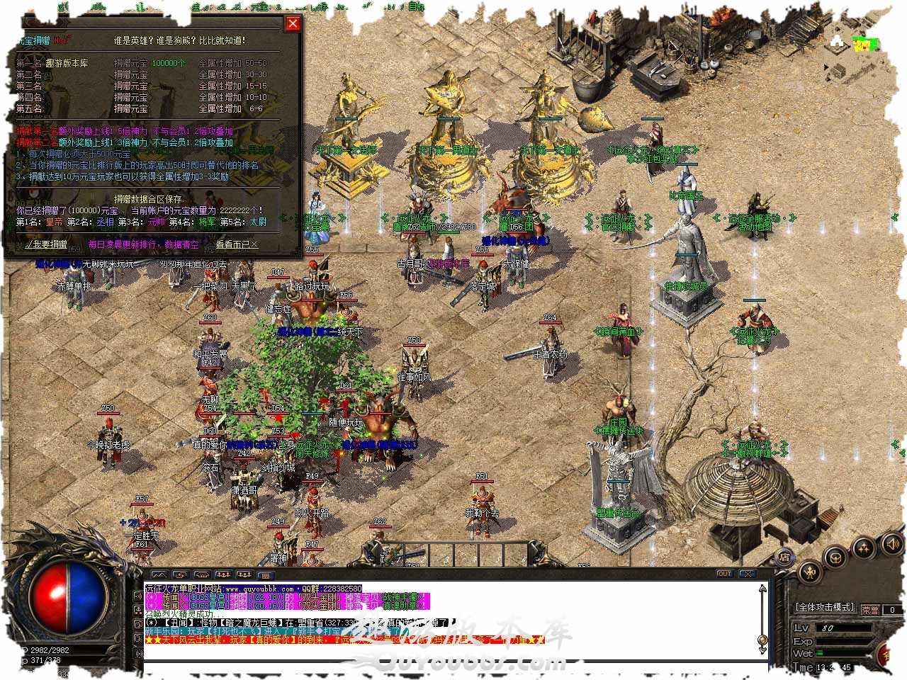 版本介绍:本服为2022年新1.82远征火龙微变版本,专业传奇团队,版本长期更新! 版本介绍:本服喊话不在需要佩带装备,直接@传+输入内容即可,每次需花费元宝50000,望大家周知! 版本介绍:道士不再弱,50召唤狂奔的猎豹,55级奔放的狮子,60级=地狱的野狗,65级=东北的老虎,70级=变异的火虎! 装备鉴定:本服开放装备鉴定系统,品质优秀、完美、卓越、品质越高分配的BUFF属性种类越多,鉴定过品质的武器,可以将Buff转移到其他武器上,品质不满意,可以洗掉重新鉴定! 优秀:红名 和平 随机抽一种(失败武器不会消失,只允许终极武器鉴定BUFF)。 完美:红名 和平 卸装随机抽一种(失败武器不会消失,只允许终极武器鉴定BUFF)。 卓越:红名 和平 卸装 失明 冰冻随机抽一种(失败武器不会消失,只允许终极武器鉴定BUFF。 版本介绍:独家上古兵书系统,参透上古兵书的力量,增强自身属性,0代表当前兵书没有学习不能升级1代表当前兵书等级为1级,春秋可提升200级其他100级,提升上古兵书成功率为50%-每次5000元宝。 版本介绍:武器可以随机附加一种技能,《十步一打》 《冰霜群雨》等,附加技能需要1000积分,更换技能需要1000积分,注意:附魔的技能无法转移到其他武器,谁带这个武器谁拥有这个技能。 版本地址