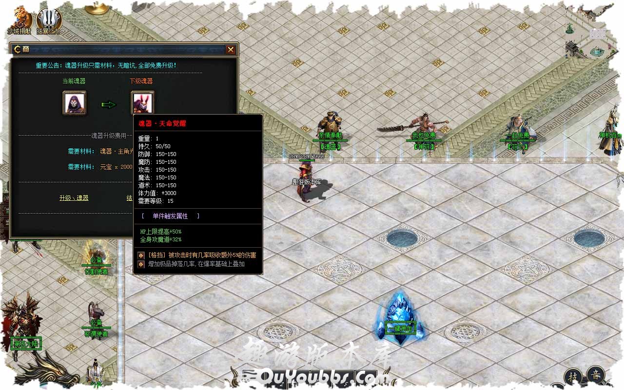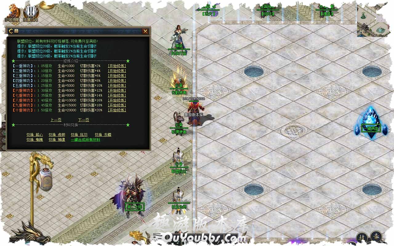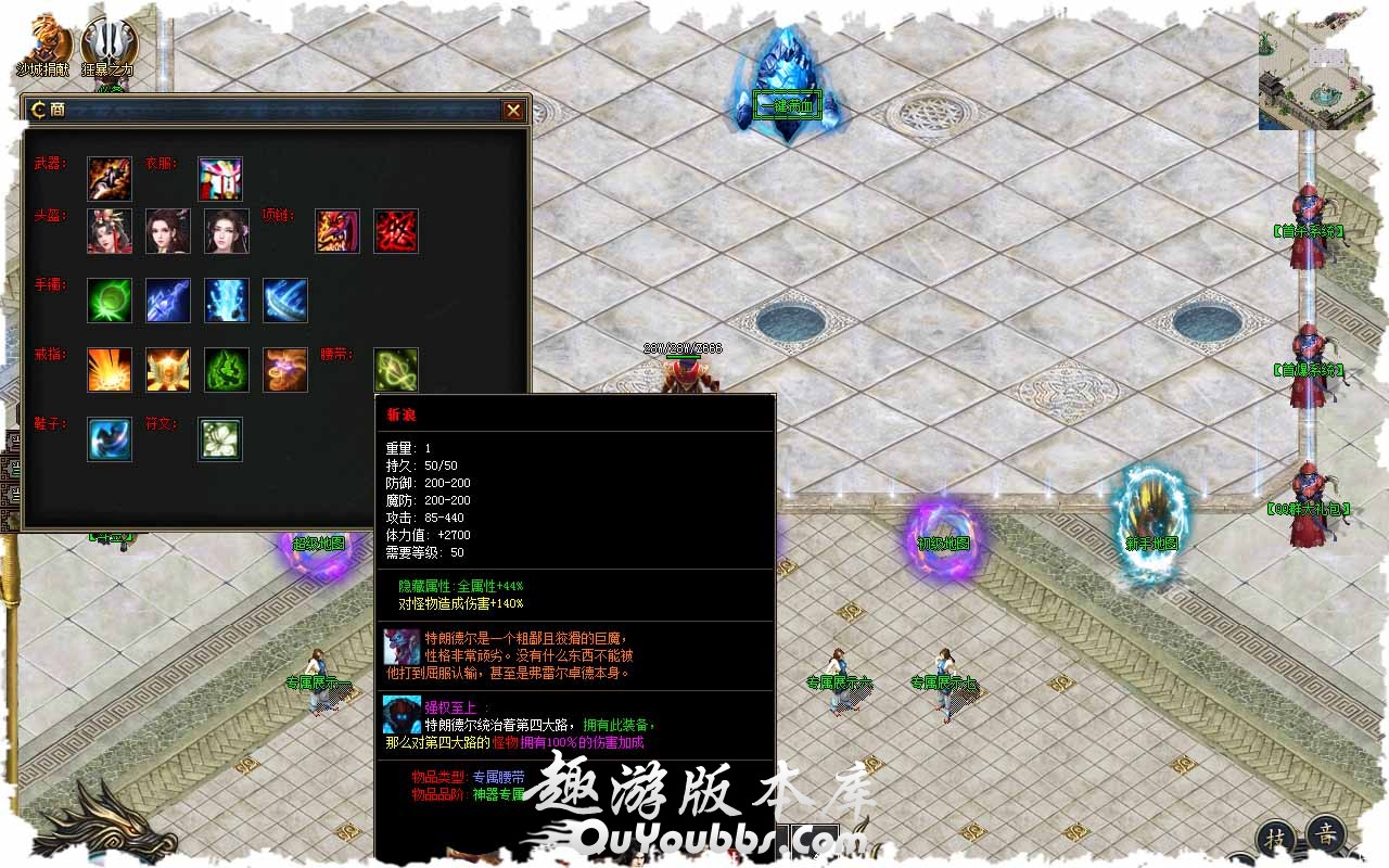 【版本介绍】新增游戏点回馈系统,200游戏点可学习技能全屏吸怪。擒龙手,爆率提升200%,开通专属打宝BOSS之家!(刷新世界BOSS!),概率切割当前2%生命值,可叠加其它切割。 【版本介绍】本服所有锻造绝无积分等要求,材料和元宝绝不难打,散人一样到**,本服**时装[须佐之男]超级BUFF---防爆,对怪触发刀刀定身! 【版本介绍】神机百炼加成:防御魔御+100,攻魔道+100,生命魔法+1000,打怪爆率+150%、切割威力+10%、格挡防御+60,多张专属地图(每个大陆一张)。 【版本介绍】灵魂之石可合成,可锻造本服所有物品,在相关NPC处可免费把灵魂碎片合成灵魂之石!,所有怪物都有几率爆出碎片,只有BOSS能爆出灵魂之石。 【版本介绍】狂暴之力加成:物理伤害+15%,暴击几率+5%,宠物额外继承主号50%攻击力!,多张专属地图(每个大地图1张)! 【活动介绍】所有活动均为弹窗提示,如误关活动对话框,可以来这里重新进入,【真假暗殿】:开区120分钟刷新100只怪物,其中30个必爆20W元宝,20只必爆100积分,【开区送宝】:开区30分钟BOSS神器大放送,活动一共举行3次。 版本地址