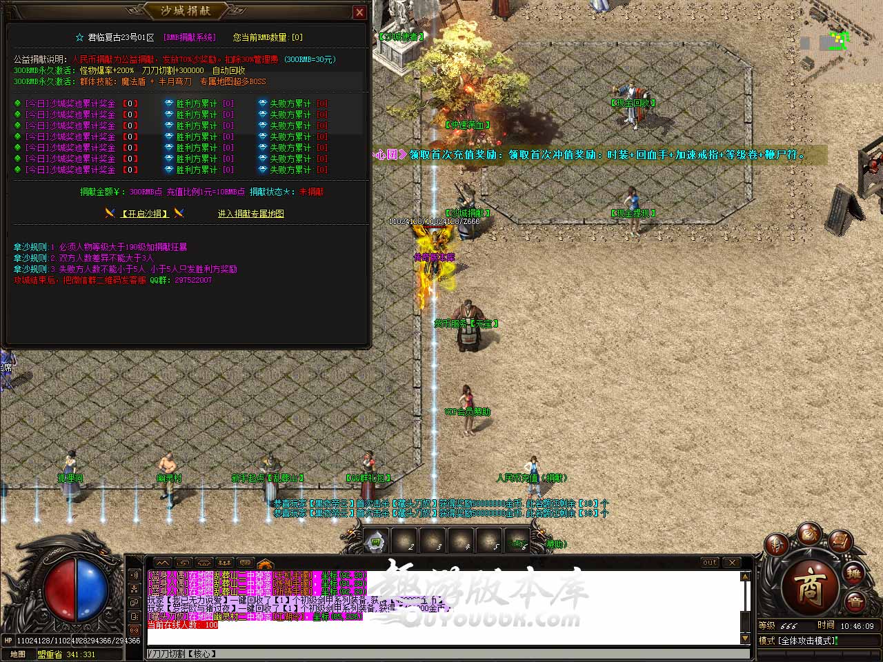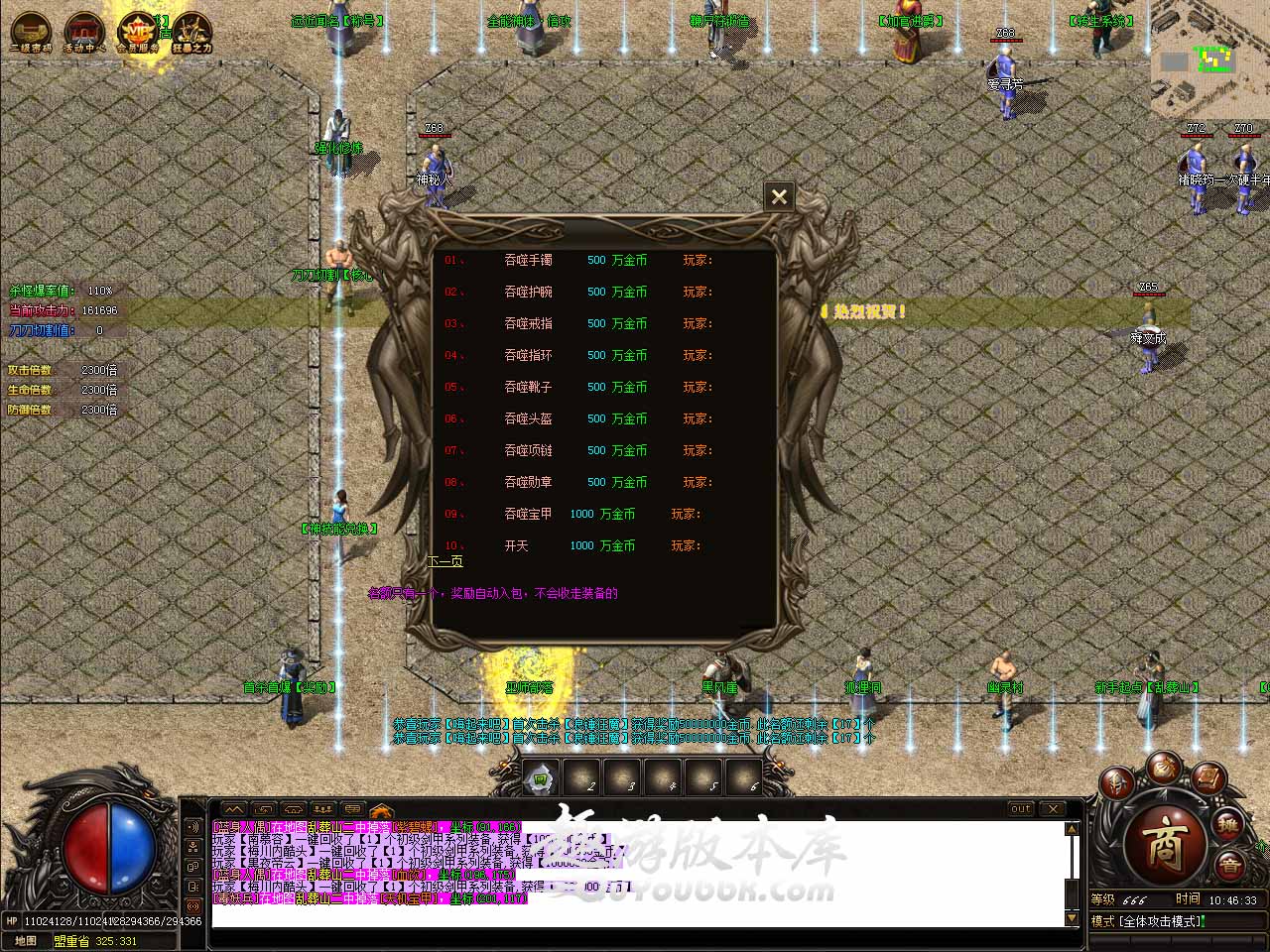 【版本介绍】游戏比例: 1:10和1:10游戏点! 【版本介绍】本服是一款微变复古倍功神器版本,地图超多爆率全开。 【版本介绍】无套路,无暗坑,一切靠打,进服体验10分钟。 【版本介绍】每天固定开放6-8个新区,开区时间以登录器上为准!! 【版本介绍】新区第三天 下午13-18点合区,新区第三天晚 上集体攻沙发放红包。 【版本介绍】本服采用插件封挂+人工5* 24小时不定时巡查,开挂必封打造绿色游戏环境。 【版本说明】新增升级奖励玩法,领取奖励前请把背包清空领取最好!最少需要40格背包空格,前3名优先达到188级的玩家均可以在此领取等级奖励,第一位达到188级玩家奖励:元宝 +200个,七彩★冰魄章,第二位达到188级玩家奖励:元宝 +100个,朱雀の战章,第三位达到188级玩家奖励:元宝 +50个,黄金の战章。 【版本说明】土城可完成4重转生,转生证明各大地图可以爆出,一重转生等级降低1级,奖励:全属性倍攻50倍,需要材料:等级50级,金币100W。 【版本说明】全能神体·Lv6以上每次提升消耗:七彩冰晶*20+10个元宝,属性:全属性递加倍攻+100,进阶规则:全能神体进阶成功自动获得下一级神体,进阶失败不掉级(只扣材料不会扣除货币)。 版本地址