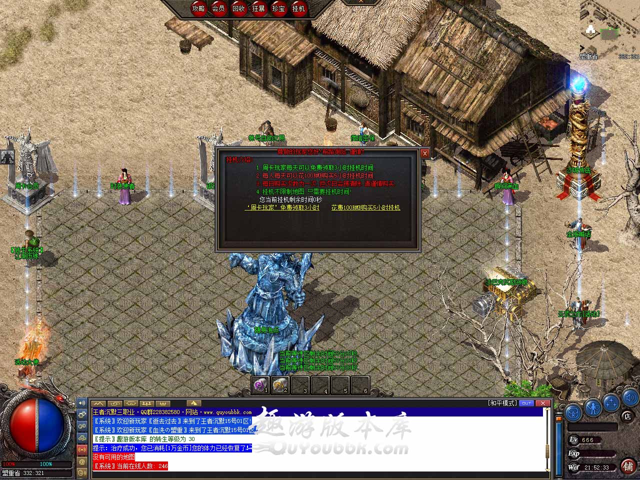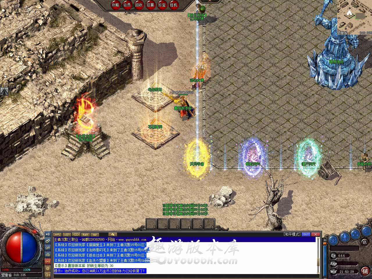 【职业玩法】:本服三职业设置平衡,玩什么职业就看个人手法与喜好!!! 【活动介绍】:本服活动无限循环,精彩无限,为避免玩家之间差距凌晨2:00至早上10:00暂停所有活动! 【本服公告】:本服一切靠打无合成,无任何隐藏内容,拒绝家族团队,给散人打造纯净绿色的轻变传奇,公平.公正.公开是我们的宗旨。 【本服声明】:游戏合理设置,下图没有任何限制,等级全靠自己打怪提升,升级可以找法师组队等,时装并非必须品,散人玩家都可通过打怪获取,一切靠打无任何合成,本服仅出一个周卡会员,无任何套路月卡和终身会员制,玩的就是情怀。 【版本介绍】:本服为长久耐玩服,特色超多,独家版本,不要想着一天就终极 【玩家交流】:版本由我们自己独立完成,所以辛苦可想而知,希望兄弟们多多支持,我们会好好的维护好此服! 【版本介绍】:世界BOSS刷新时间为 10点 16点 22点 坐标[盟重省][832,655], 坐标[苍月岛][558,697]坐标[洛阳城][369,530]! 【版本介绍】:散人前期可以打到聚灵珠,如果没有就用金币购买,保证等级领先,地图里一定要优先打橙色、紫色、红色BOSS(收集历练卷),商场里可以购买1.2倍限时经验勋章,周卡每天可以领取一个,打到基础装备了直接去地图最后层,打红色BOSS,小怪提供大量经验和货币,后期洛阳城小怪都可以爆神器,散人可追梦。 版本地址