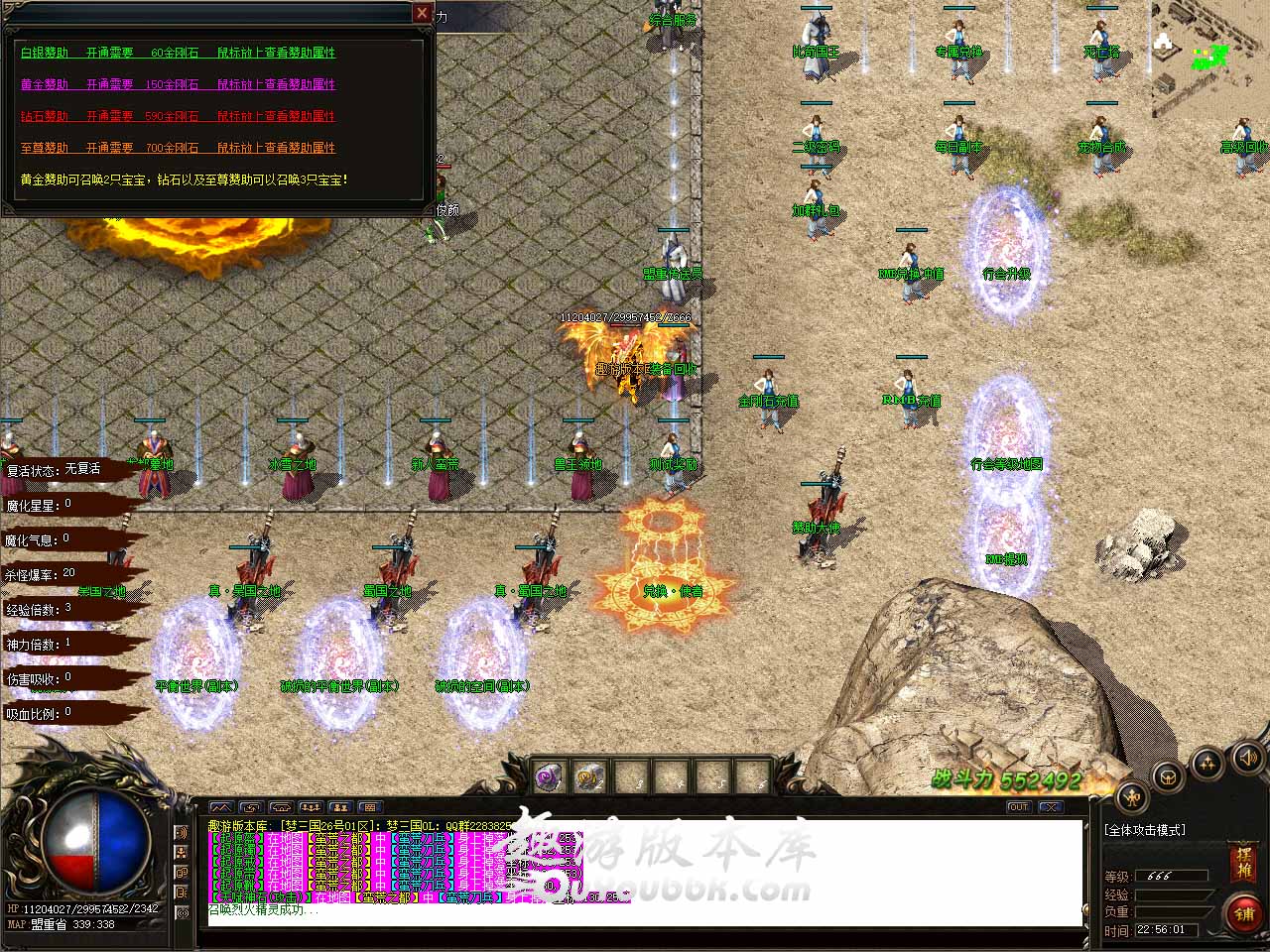 1.新手上来以后强烈建议【沙城捐献】!强烈建议【沙城捐献】!强烈建议【沙城捐献】!强烈建议【沙城捐献】!强烈建议【沙城捐献】!强烈建议【沙城捐献】!!重要的事情说无数遍!有条件的话可以用金刚石开启狂暴!新手上来把三国血符和三国祝福仍在地上在拾起这样就会出属性,如果属性不好可以建立小号。(两件装备最好鉴定的好点前期比较有用) 如果需要前期起步快的话,那个58元的捐献会在普通捐献基础上多赠送58W元宝,可以用于前期洗练装备使用! 2.鉴定好血符以后下面就是要打元宝打500-1000元宝然后再土城的左上有个“切割鉴定”的npc优先把祝福和血符鉴定切割,可以有效提高新手发育! 3.有了这两件装备就可以去三国镜像地图、各大主城地图、兽王地图打蓝色的怪了这些怪出传说、寒风等装备还出一些特殊装备如修炼系列套装、超级修炼套装、麻痹、复活生肖、1.1的武器衣服、1.2的武器衣服、1.3的武器衣服。打到这些装备继续鉴定切割提升打怪效率。 5.在有一定的装备以后(切割鉴定完成总体数值在50000左右)可以打粉色的怪(最好有麻痹、复活生肖),粉色怪物除了会爆蓝色怪物所报的装备外还会出99-99、122-122的装备,1.3武器衣服、1.4武器衣服、超级刺打戒指、神圣元素之心当然爆率很高一切看运气。 6.装备切割数值感觉够用了,就可以考虑升称号。称号主要加经验倍率、打怪爆率、倍攻,还可以进入称号地图避免无怪可打的局面。有多余的元宝可以修炼商城的技能优先选择逐日、开天。护体神盾等有钱再说吧。 7.在积累一定的装备后0-38充值的玩家最少到100级,100级会送个专属宝宝供散人发育!100充值的玩家因为有黄金赞助上来就有两个宝宝可以考虑打红色的188W的怪物(司马懿、司马昭、孙尚香、诸葛亮、吕梦茹、荀彧)这些怪会爆1.7以下的武器衣服等装备,最主要的是会爆低级的三国专属装备。运气好打到三国装备就可以去三国专属地图,三国专属地图的爆率相对高一些。 8.然后就是循序渐进挑战388W、1888W、3888W的怪物,积累装备着时候如果是想升级可以带修炼套装(修炼非常好打)。当然在挑战高级的怪也是有方法的很多地图都有卡怪的位置。如称号地图,三国专属地图、充值地图都会有卡怪的位置。 9.开区以后双数整点会刷新三国福利怪,怪物锁血,每个怪物必爆2点金刚石,金刚石的作用很大40个金刚石可以在土城右面开启狂暴,或者用游戏点和元宝开启称号,增加爆率、倍攻、血量。金刚石还可以开启赞助称号分别消耗38、62、500、600,这个就看个人了只要有恒心,不充钱一样可以到至尊。金刚石还可以150以后升级用,60金刚石一级。或者可以出给老板。而且三国福利怪还会爆时装150、200、300、350、400、500、600的时装都有几率爆出这就看运气了. 10.等级到达117可以去117地图困妖界,打四神兽怪,四神兽怪物会出青龙、白虎、玄武、朱雀印记,可以自己用或者出给老板。 11.等级到达150级可以去土城左上角的六界地图领取魔法盾一本来提高抗怪能力!150级后才是游戏的开始,可以用打到的专属装备兑换金刚石,用来提升等级,因为这个游戏等级就是王道! 版本地址