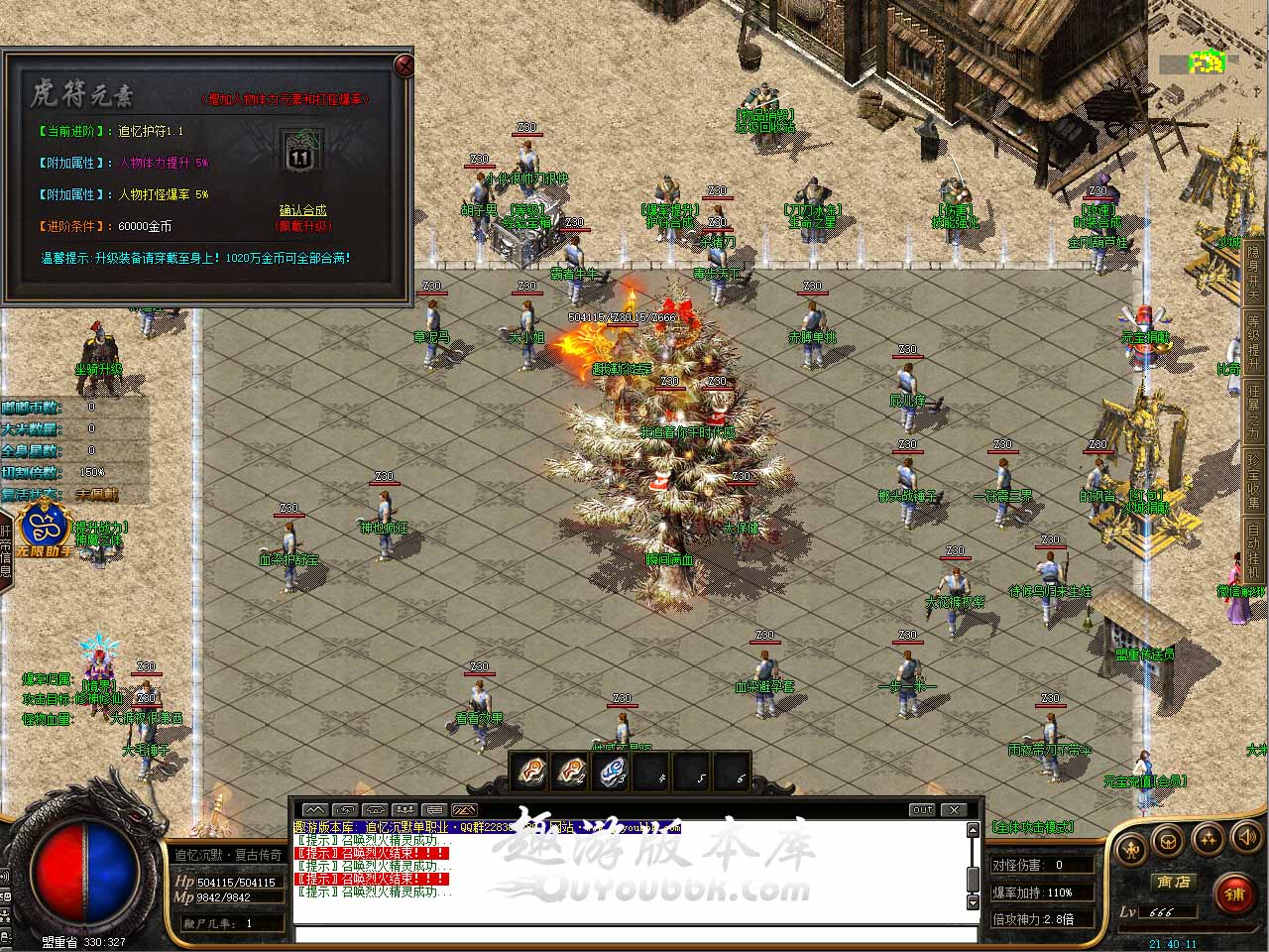 版本介绍:130级提升至140级,追忆神石*20+200万金币+200元宝!100%成功升级! 版本介绍:高级专属合成,能到这一步,证明你已经是整个玛法大陆的风云人物!我可以为你激活出更高境界的神兵利器!不过还需要你凑些东西才行,具体情况点击下方了解。 地图介绍:远古卧龙【等级地图】,刷新纵横怪,寂静怪,梦回怪,爆高级装备系列,本地图有“梦回”怪哦,进入条件:此地图需要等级达到120即可进入。 版本介绍:新增特色楼兰地图,进入需要[十重魔化]!请先去"楼兰古城"243,202坐标"魔君七夜",同时需要200万金币才可进入。 版本地址
